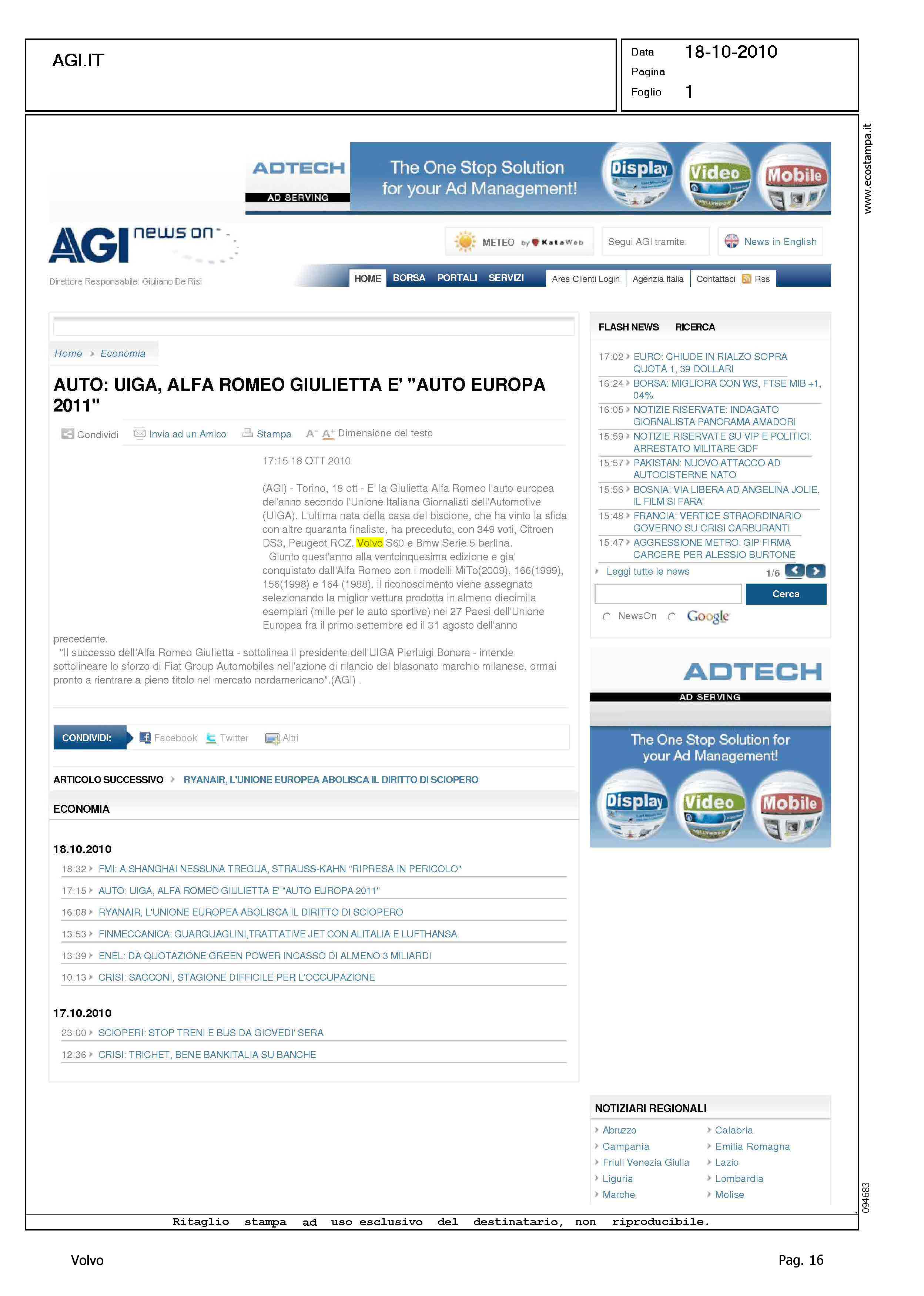 Author: Line: Corporate Model: Corporate Subject: - Title: AUTO: UIGA, ALFA ROMEO GIULIETTA E' 'AUTO EUROPA 2011'Highlight: UIGA - AUTO EUROPA 2011 - VOLVO S60 - POSIZIONE VOLVO, 4°