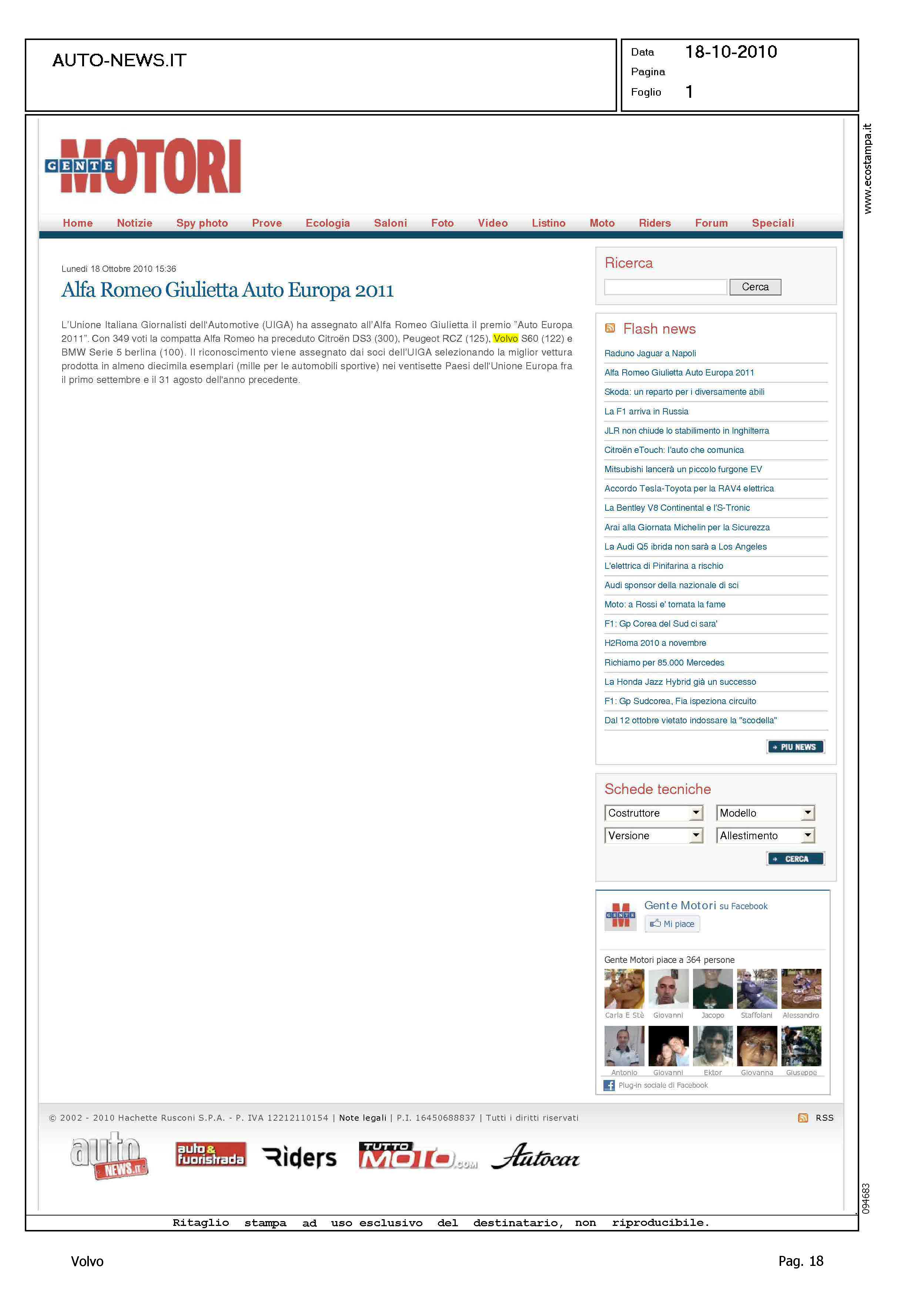 Author: Line: Corporate Model: Corporate Subject: - Title: ALFA ROMEO GIULIETTA AUTO EUROPA 2011Highlight: UIGA - AUTO EUROPA 2011 - VOLVO S60 - POSIZIONE VOLVO, 4°