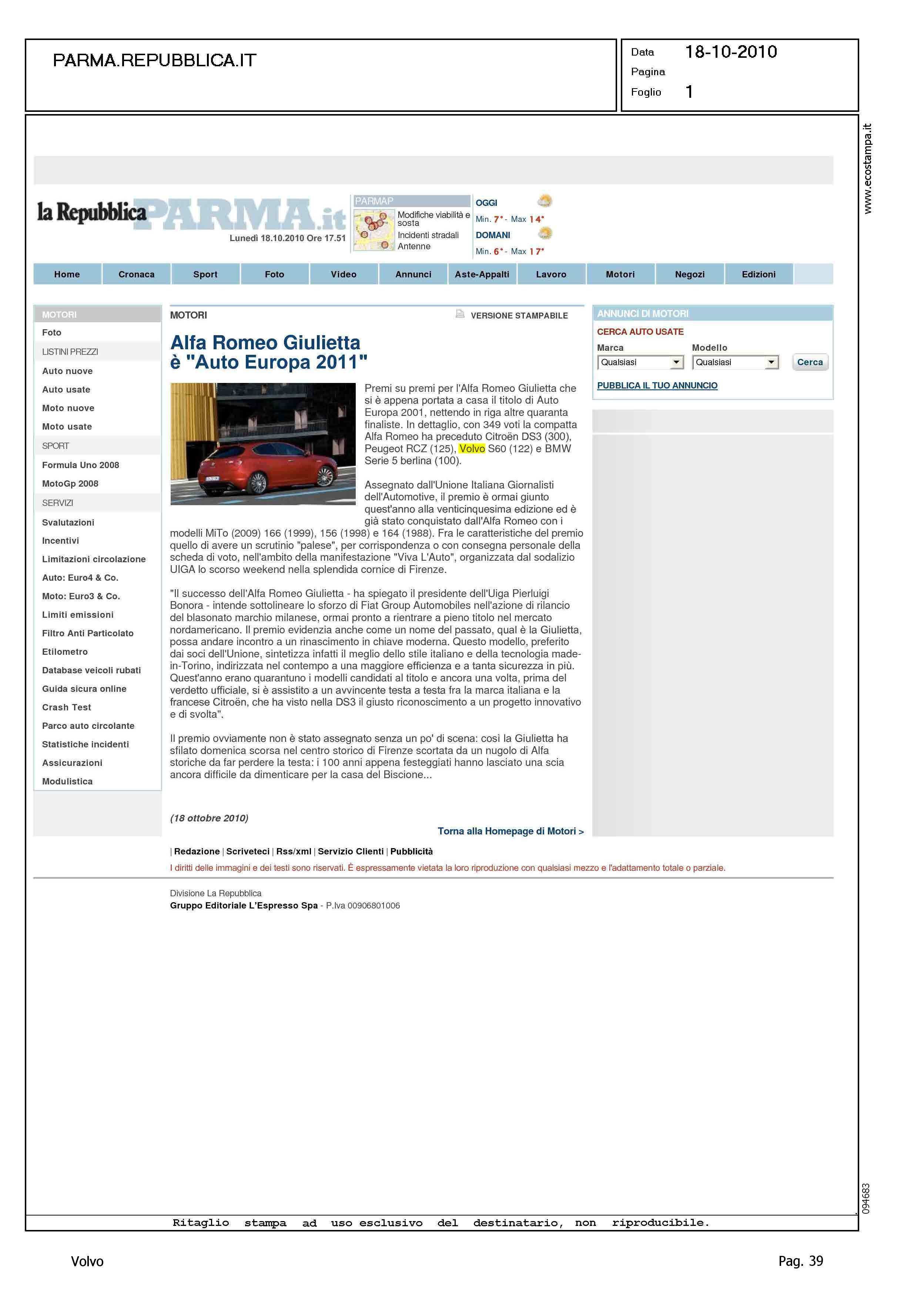 Author: Line: Corporate Model: Corporate Subject: - Title: ALFA ROMEO GIULIETTA E' 'AUTO EUROPA 2011'Highlight: (EDIZIONE PARMA) - UIGA - AUTO EUROPA 2011 - VOLVO S60 - POSIZIONE VOLVO, 4°