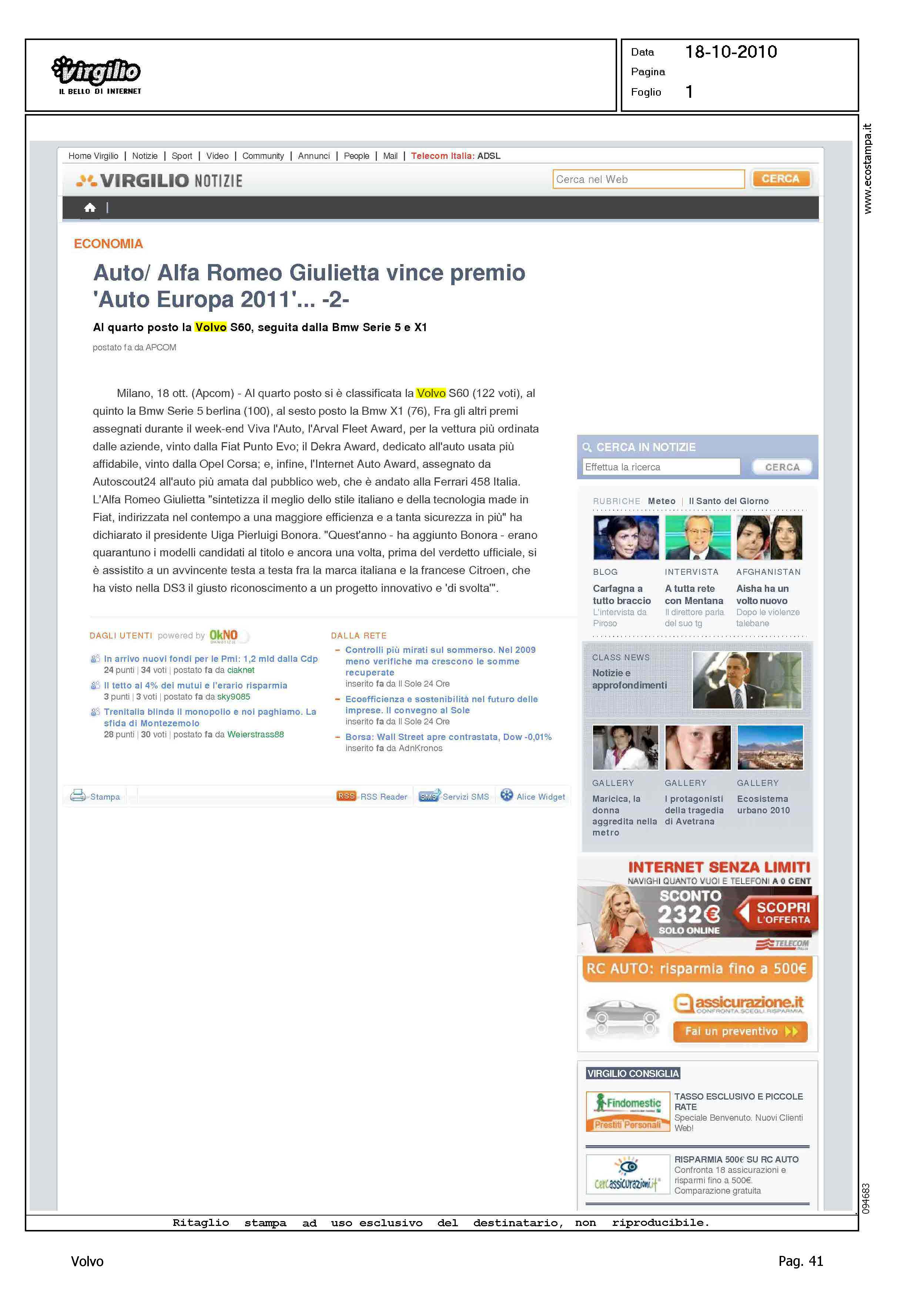 Title: AUTO/ALFA ROMEO GIULIETTA VINCE IL PREMIO AUTO EUROPA 2011...' AL QUARTO POSTO LA VOLVO S60, SEGUITA DALLA BME SERIE 5 E X1