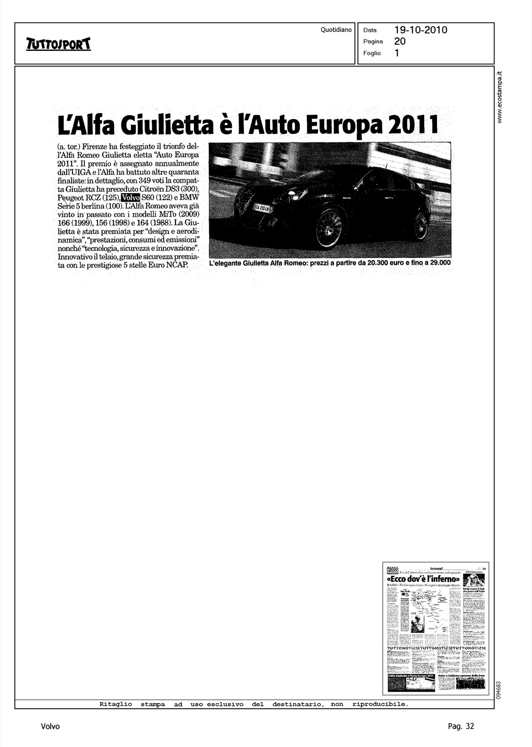 Author: Line: Corporate Model: Corporate Subject: - Title: L'ALFA GIULIETTA E' L'AUTO EUROPA 2011Highlight: UIGA - AUTO EUROPA 2011 - VOLVO S60 - POSIZIONE VOLVO, 4°