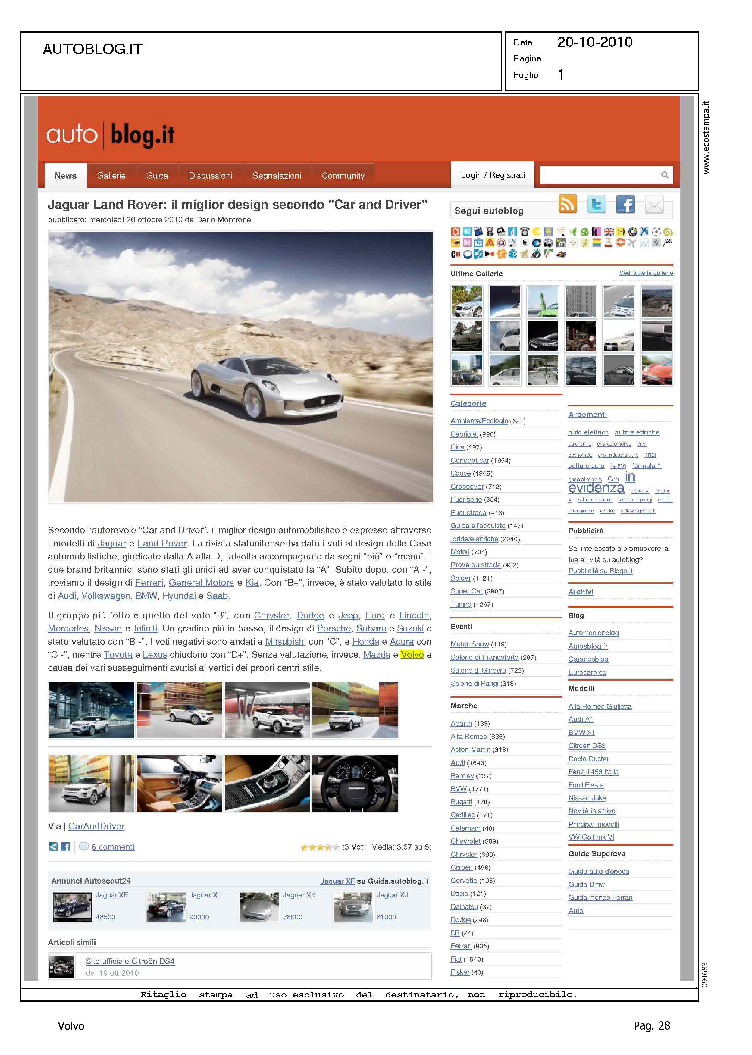 Author: Line: Corporate Model: Corporate Subject: - Title: JAGUAR LAND ROVER: IL MIGLIOR DESIGN SECONDO "CAR AND DRIVER"Highlight: DESIGN - CAR AND DRIVER - CLASSIFICA DESIGN - NESSUNA VALUTAZIONE PER MAZDA E VOLVO