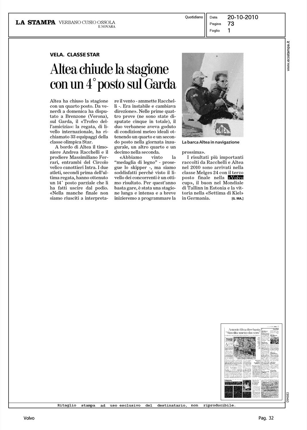 Author: Line: Corporate Model: Corporate Subject: Volvo Cup Title: ALTEA CHIUDE LA STAGIONE CON UN 4° POSTO SUL GARDAHighlight: (EDIZIONE VERBANO, CUSIO, OSSOLA, NOVARA) REGATA LAGO DI GARDA