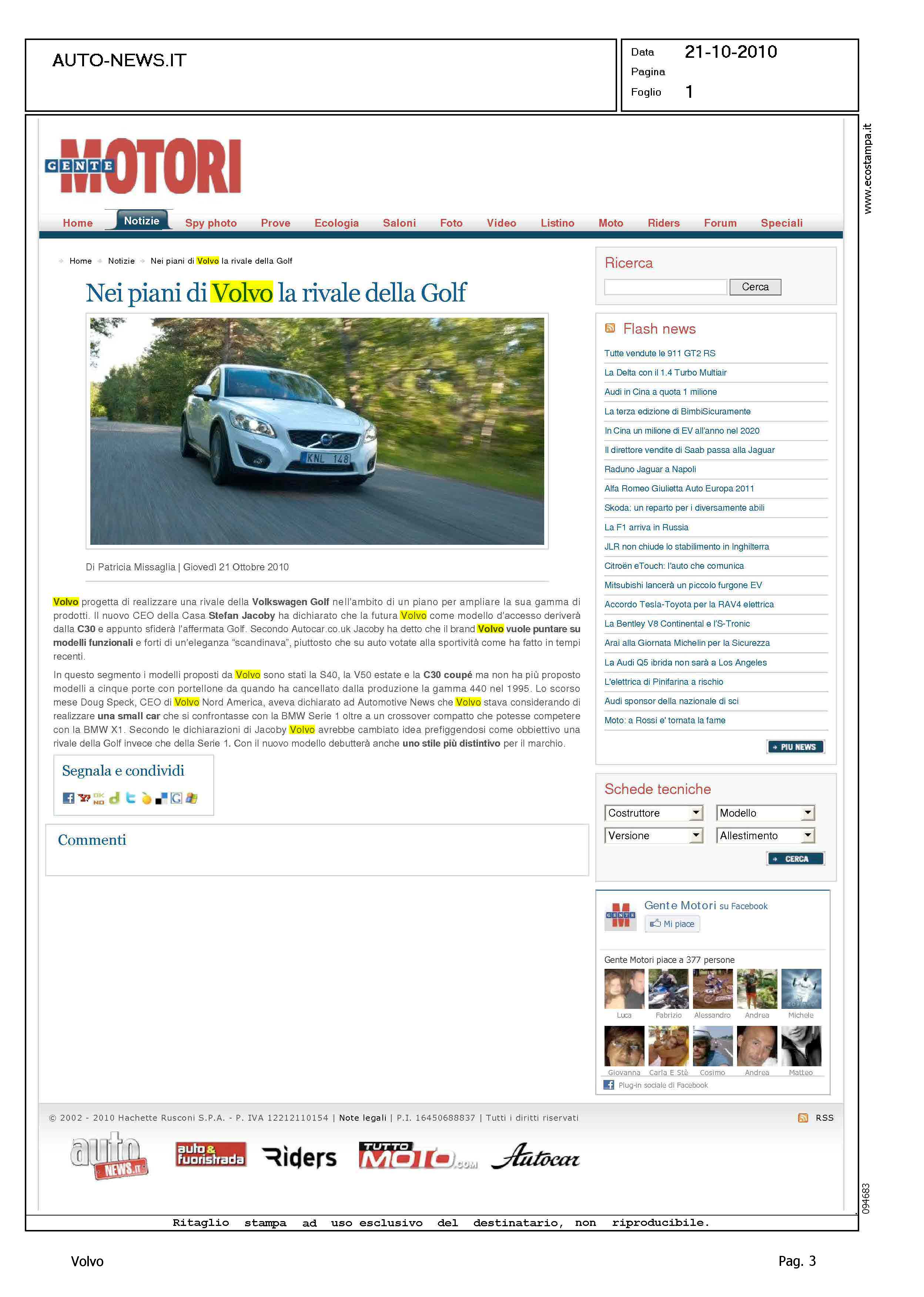 Author: Line: Corporate Model: Volvo C30 Subject: - Title: NEI PIANI DI VOLVO LA RIVALE DELLA GOLFHighlight: COMPETITOR VOLVO C30 - VW GOLF - SVILUPPO GAMMA C30