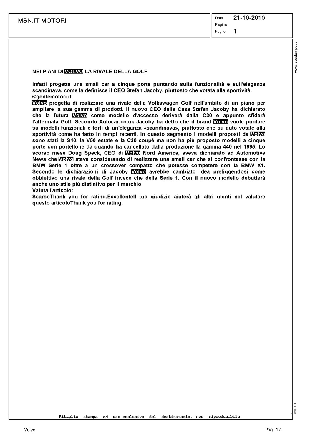 Author: Line: Corporate Model: Volvo C30 Subject: - Title: NEI PIANI DI VOLVO LA RIVALE DELLA GOLFHighlight: COMPETITOR VOLVO C30 - VW GOLF - SVILUPPO GAMMA C30