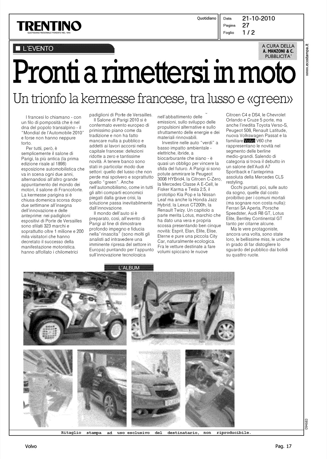 Author: Line: Corporate Model: Corporate Subject: - Title: PRONTI A RIMETTERSI IN MOTOHighlight: PARIGI - NOVITA' - VOLVO V60