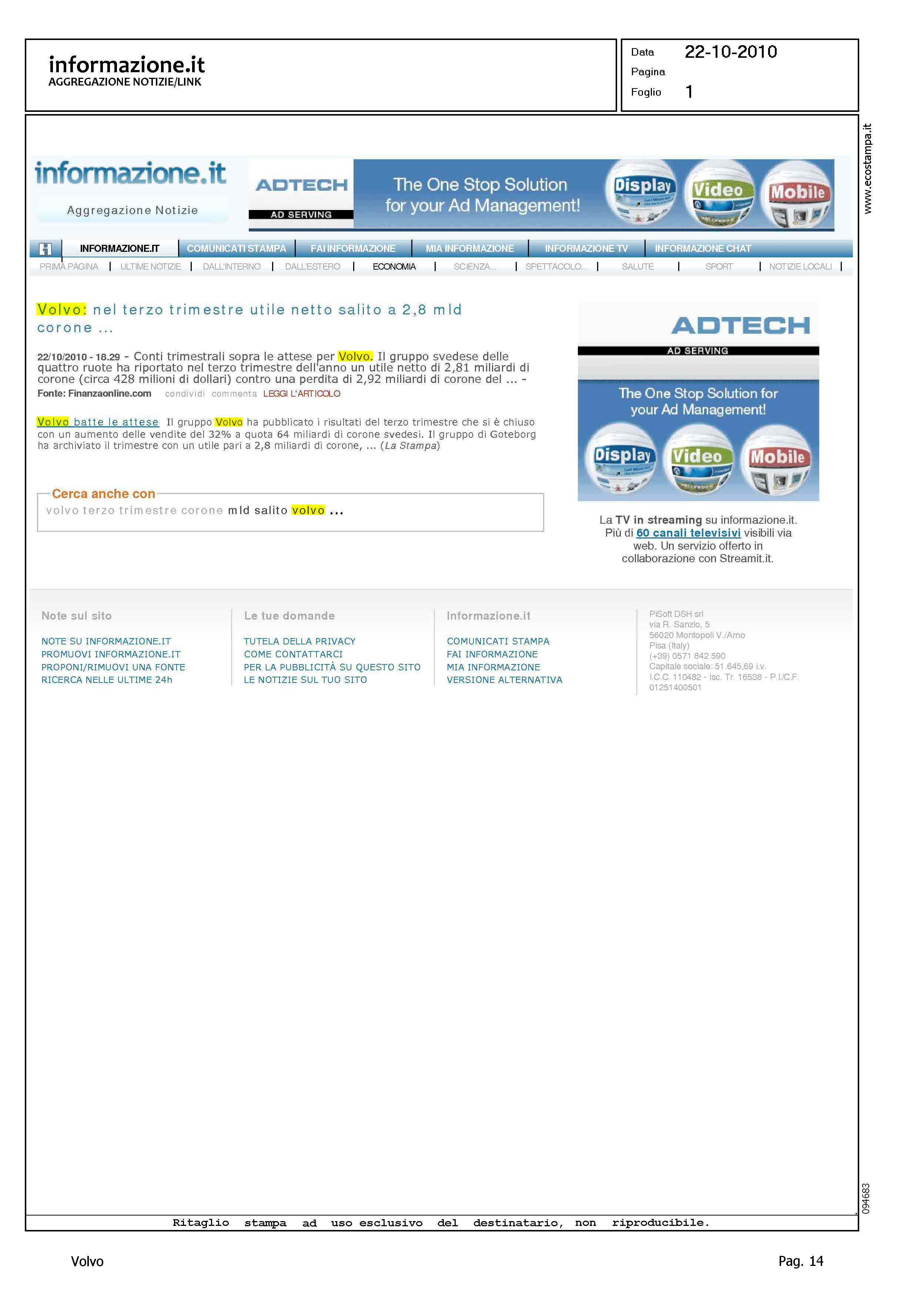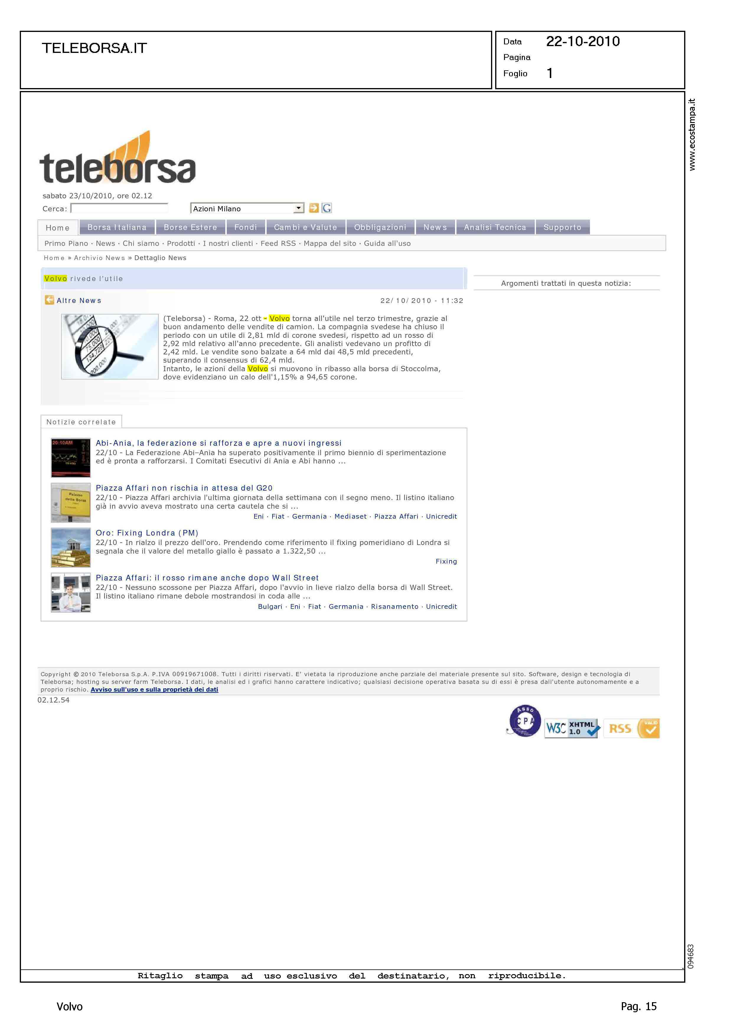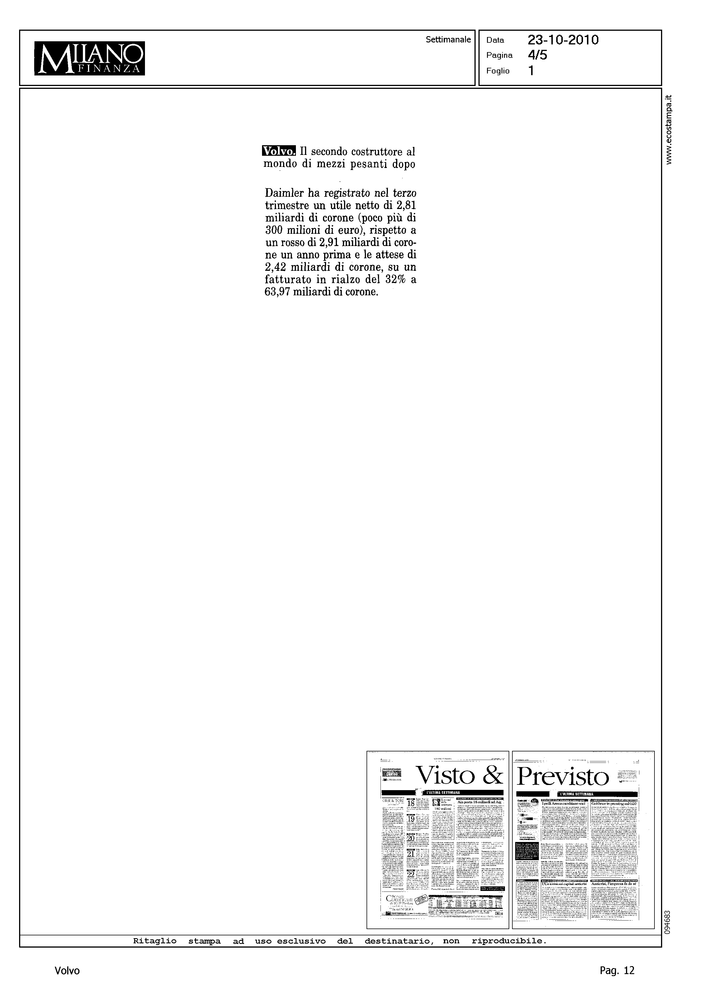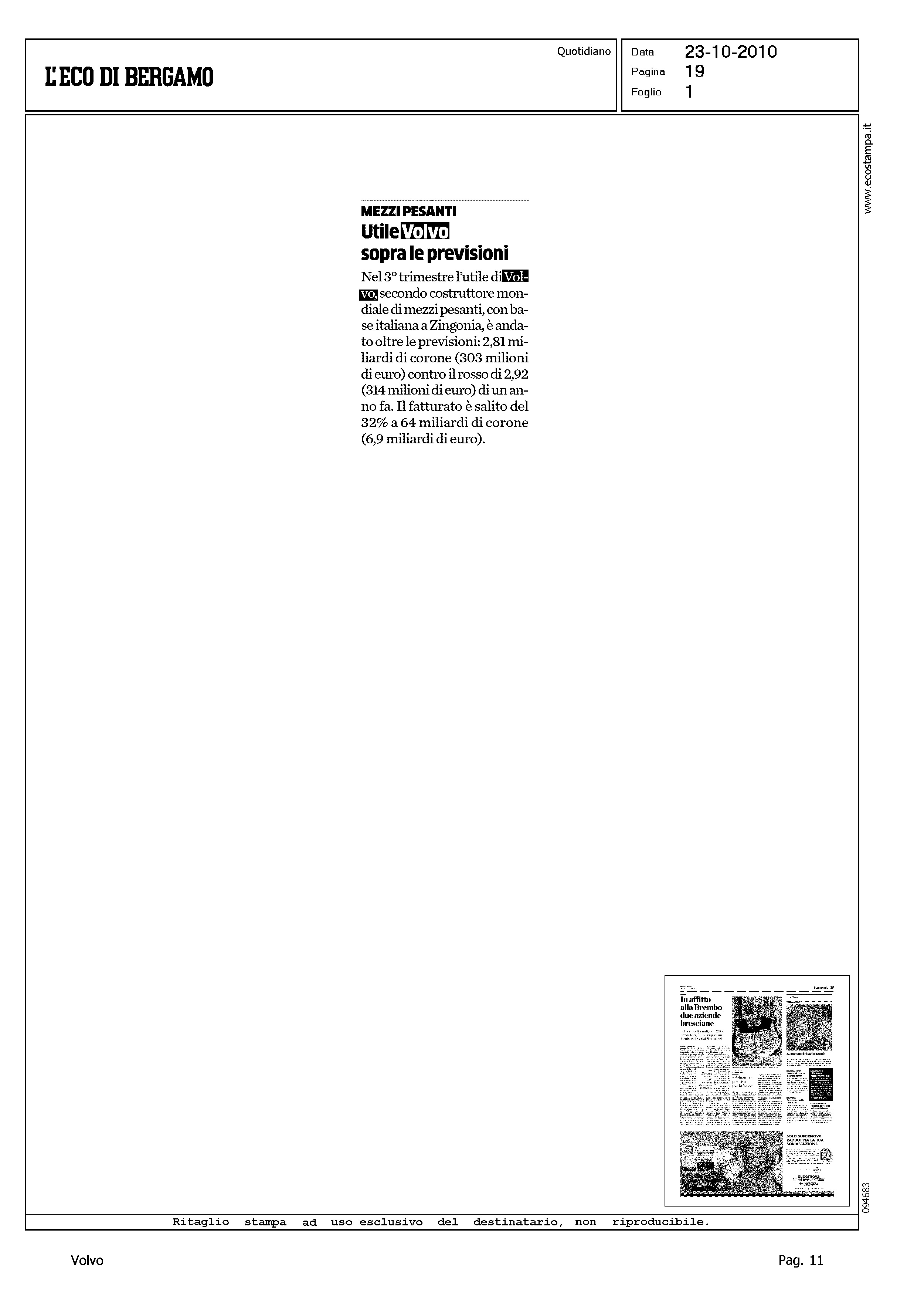 Title: ARGOMENTO, UTILE VOLVO IN TERZO TRIMESTRE - TESTATE VARIE, L'ECO DI BERGAMO - MILANO FINANZA - INFORMAZIONE.IT - TELEBORSA.IT - TITOLI VARI SU SOGGETTO