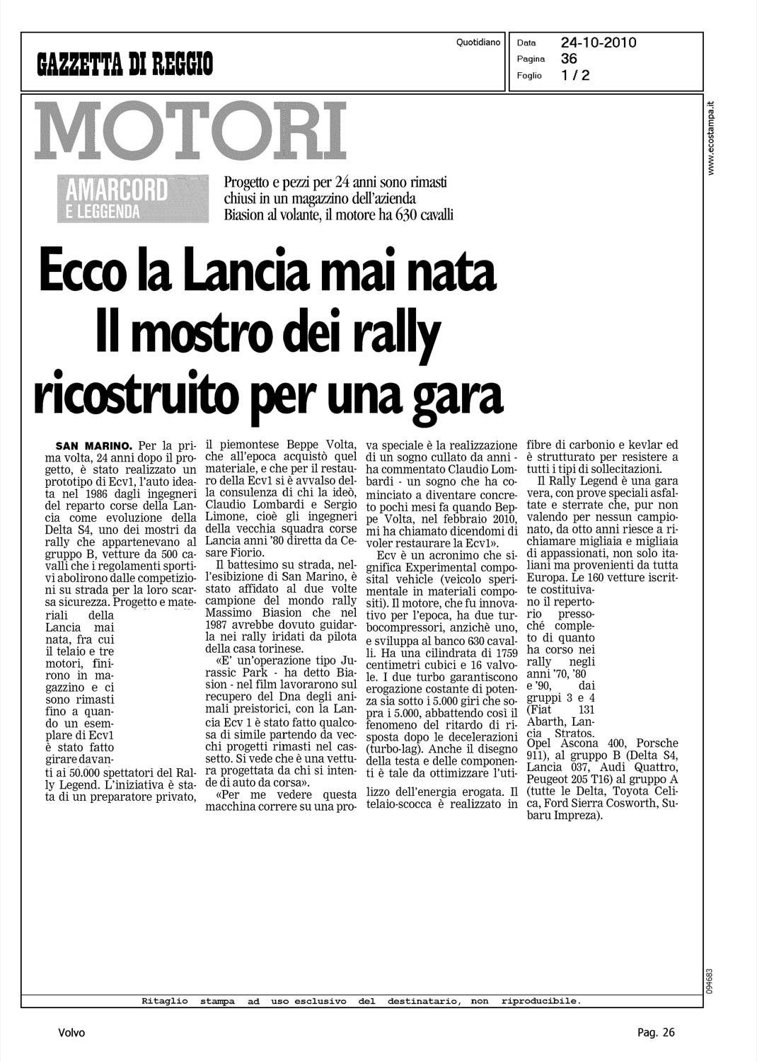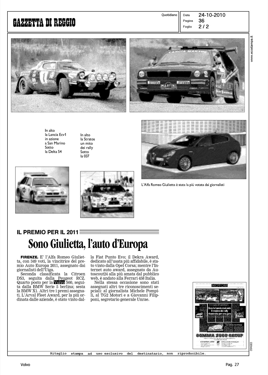 Author: Line: Corporate Model: Corporate Subject: - Title: SONO GIULIETTA, L'AUTO D'EUROPAHighlight: UIGA - AUTO EUROPA 2011 - VOLVO S60 - POSIZIONE VOLVO, 4°