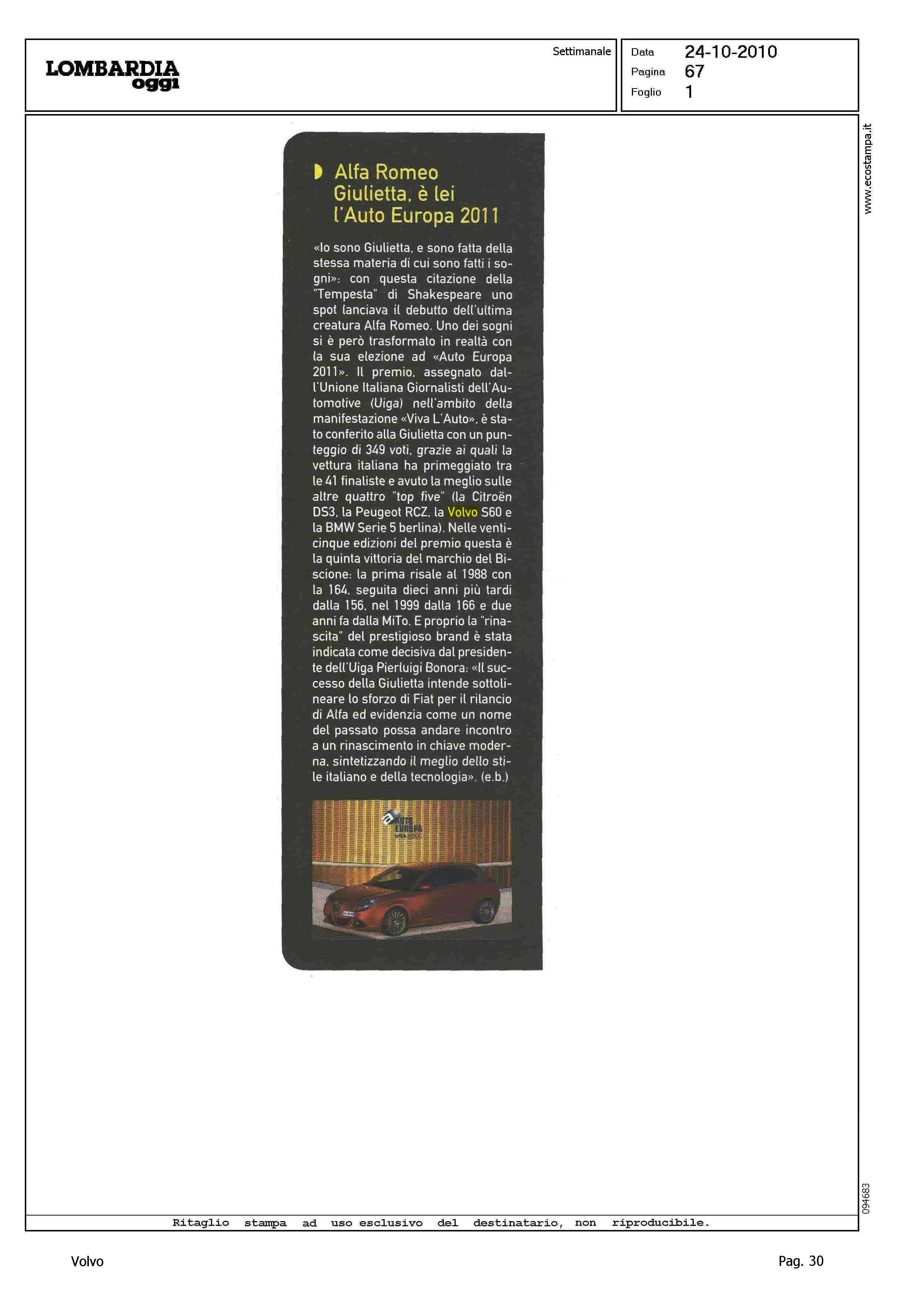 Author: Line: Corporate Model: Corporate Subject: - Title: ALFA ROMEO GIULIETTA, E' LEI L'AUTO EUROPA 2011Highlight: UIGA - AUTO EUROPA 2011 - VOLVO S60 - POSIZIONE VOLVO, 4°