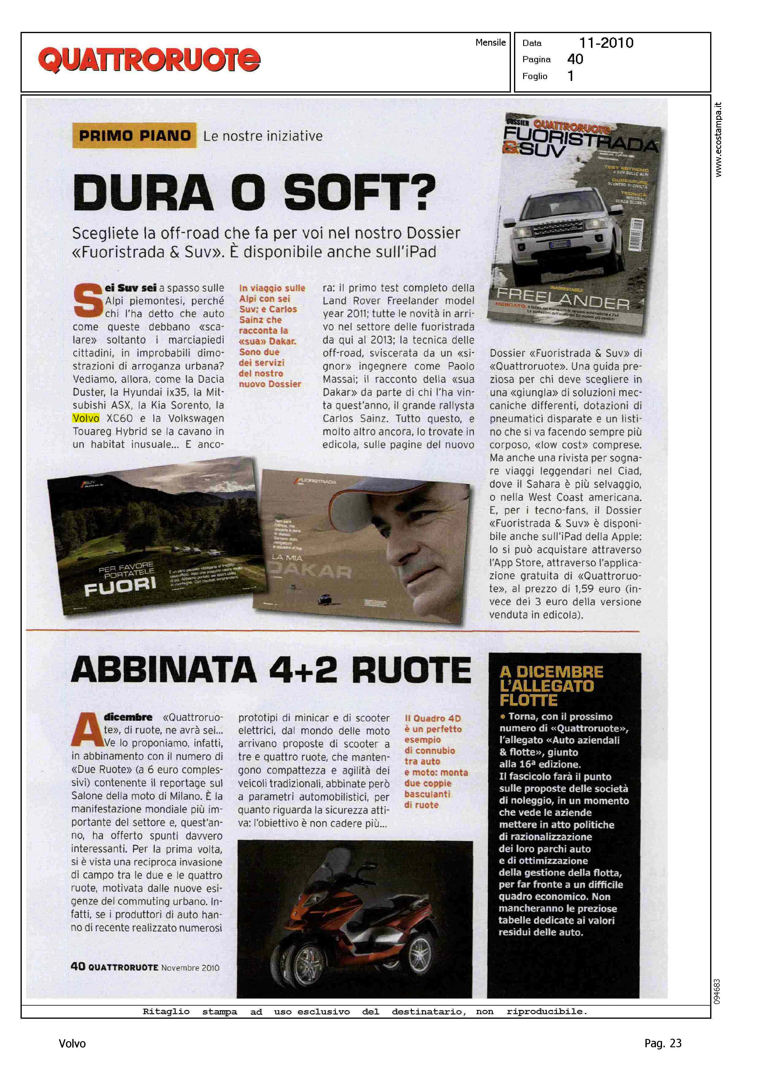 Author: Line: XC60 Model: Subject: - Title: PRIMO PIANO - LE NOSTRE INIZIATIVE - DURA O SOFT?Highlight: (USCITA NOVEMBRE) - ANNUNCIO - EDICOLA - DOSSIER FUORISTRADA & SUV - VOLVO XC60 - TEST DRIVE - IPAD - APP STORE