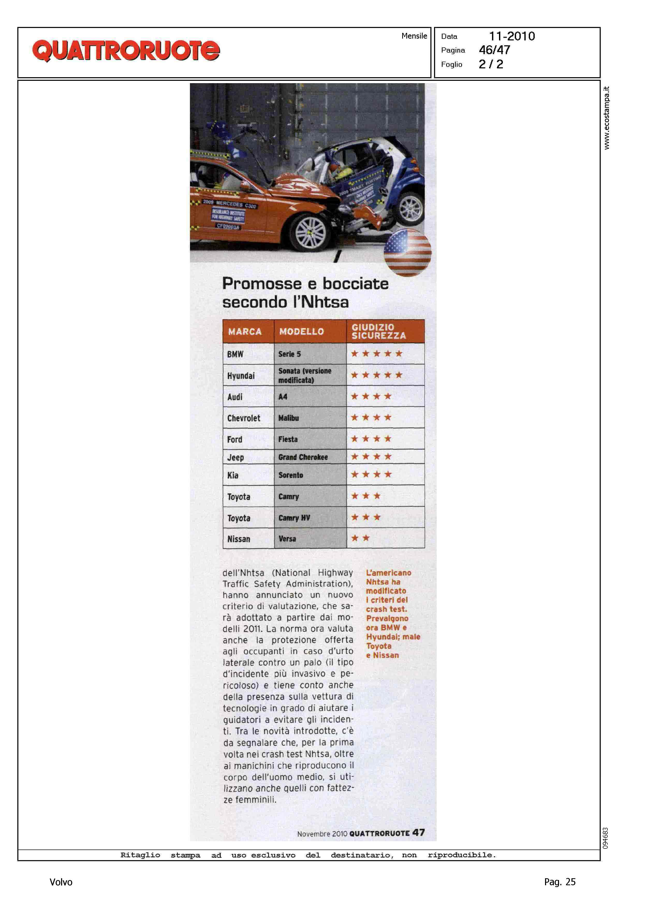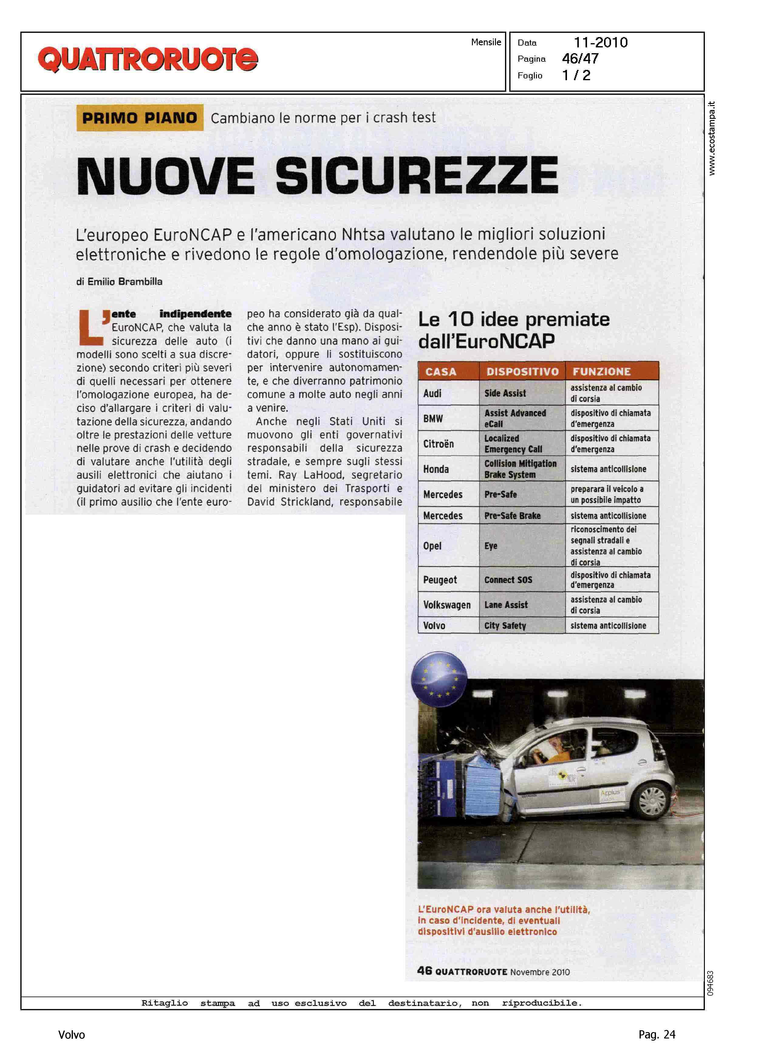 Highlight: (USCITA NOVEMBRE) - SICUREZZA - EURONCAP - VOLVO CITY SAFETY - NUOVI CRITERI VALUTAZIONE SICUREZZA - RICONOSCIMENTO EURONCAP PER LE CASE - POSIZIONE VOLVO PER CITY SAFETY