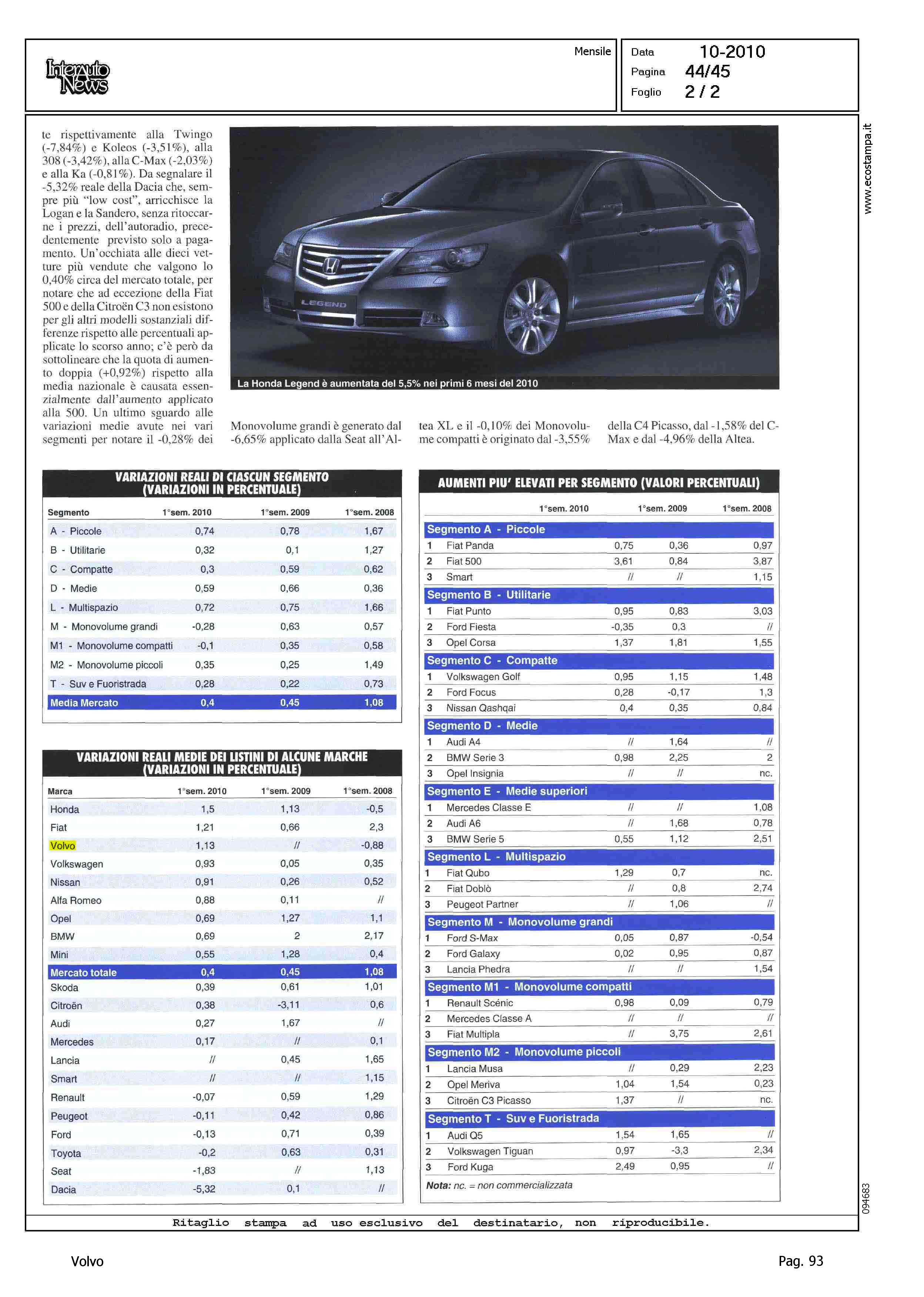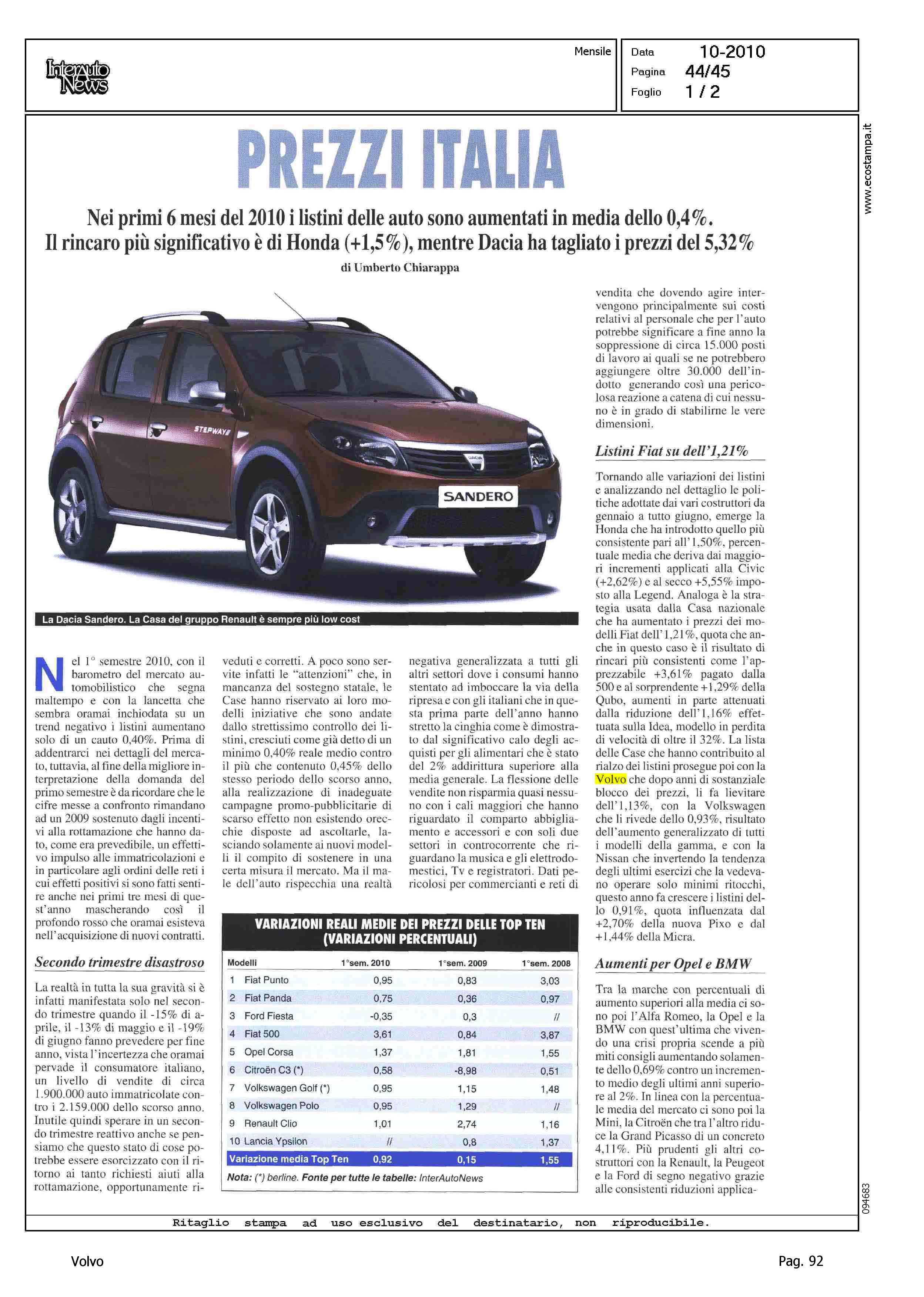 Author: CHIARAPPA, UMBERTOLine: Corporate Model: Corporate Subject: - Title: PREZZI ITALIAHighlight: MERCATO ITALIA - PREZZI AUTOMOBILI - VARIAZIONI DI LISTINO - POSIZIONE VOLVO