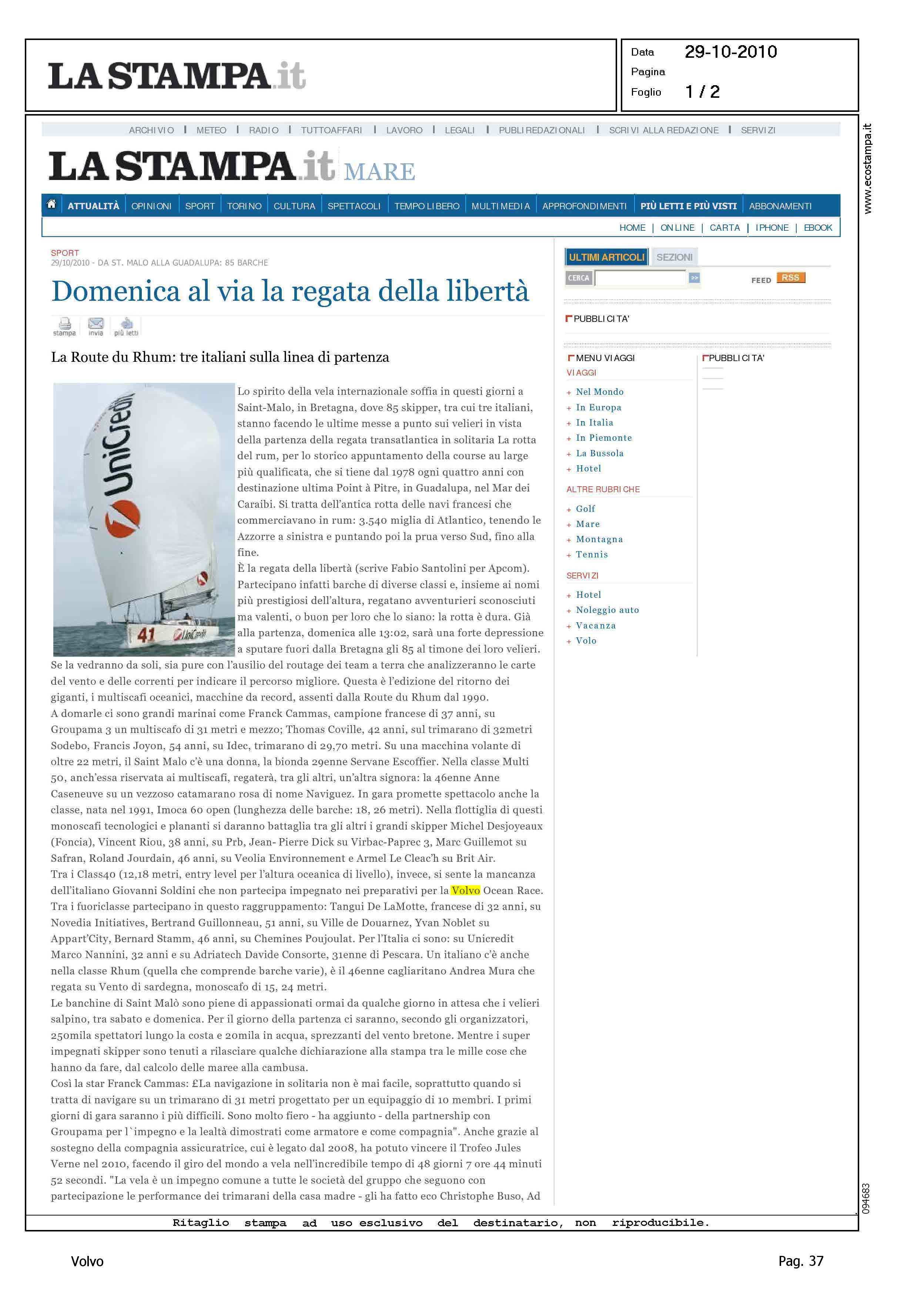 Author: Line: Corporate Model: Corporate Subject: Volvo Ocean Race Title: DOMENICA AL VIA LA REGATA DELLA LIBERTA'Highlight: VOLVO OCEAN RACE - SOLDINI