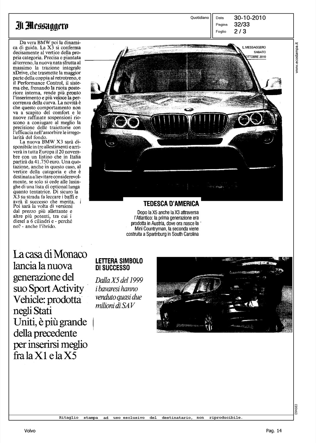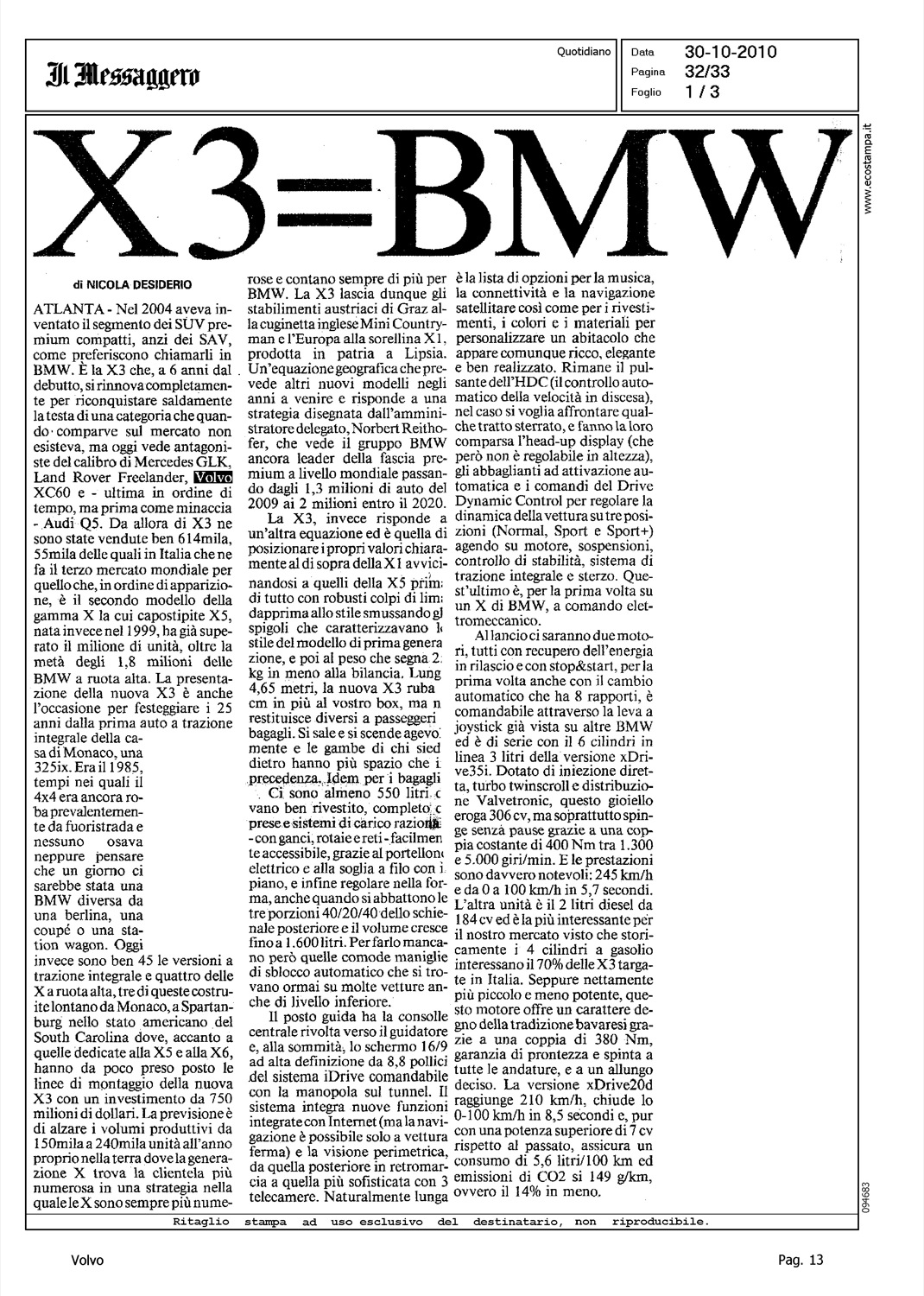 Author: DESIDERIO, NICOLALine: XC60 Model: Subject: - Title: X3=BMWHighlight: VOLVO XC60 - COMPETITOR BMW X3 NUOVO MODELLO