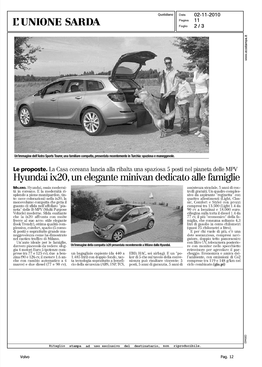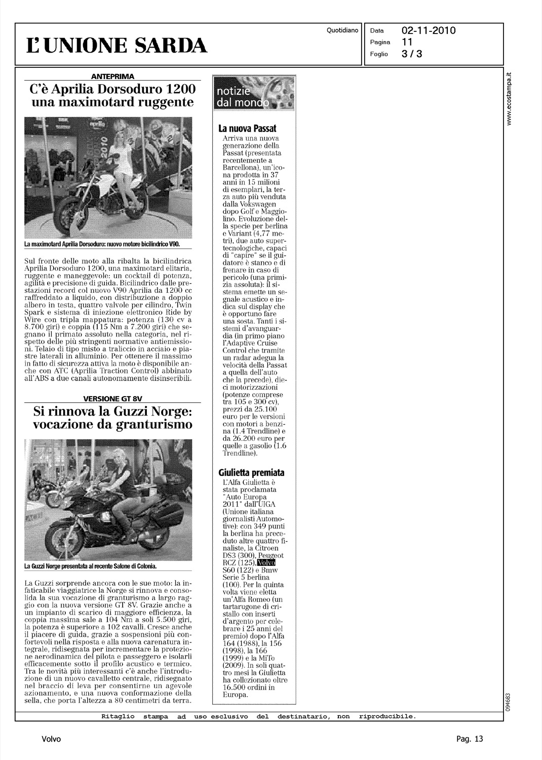 Author: PIRAS, GIANNILine: Corporate Model: Corporate Subject: - Title: GIULIETTA PREMIATAHighlight: UIGA - AUTO EUROPA 2011 - VOLVO S60 - POSIZIONE VOLVO, 4°