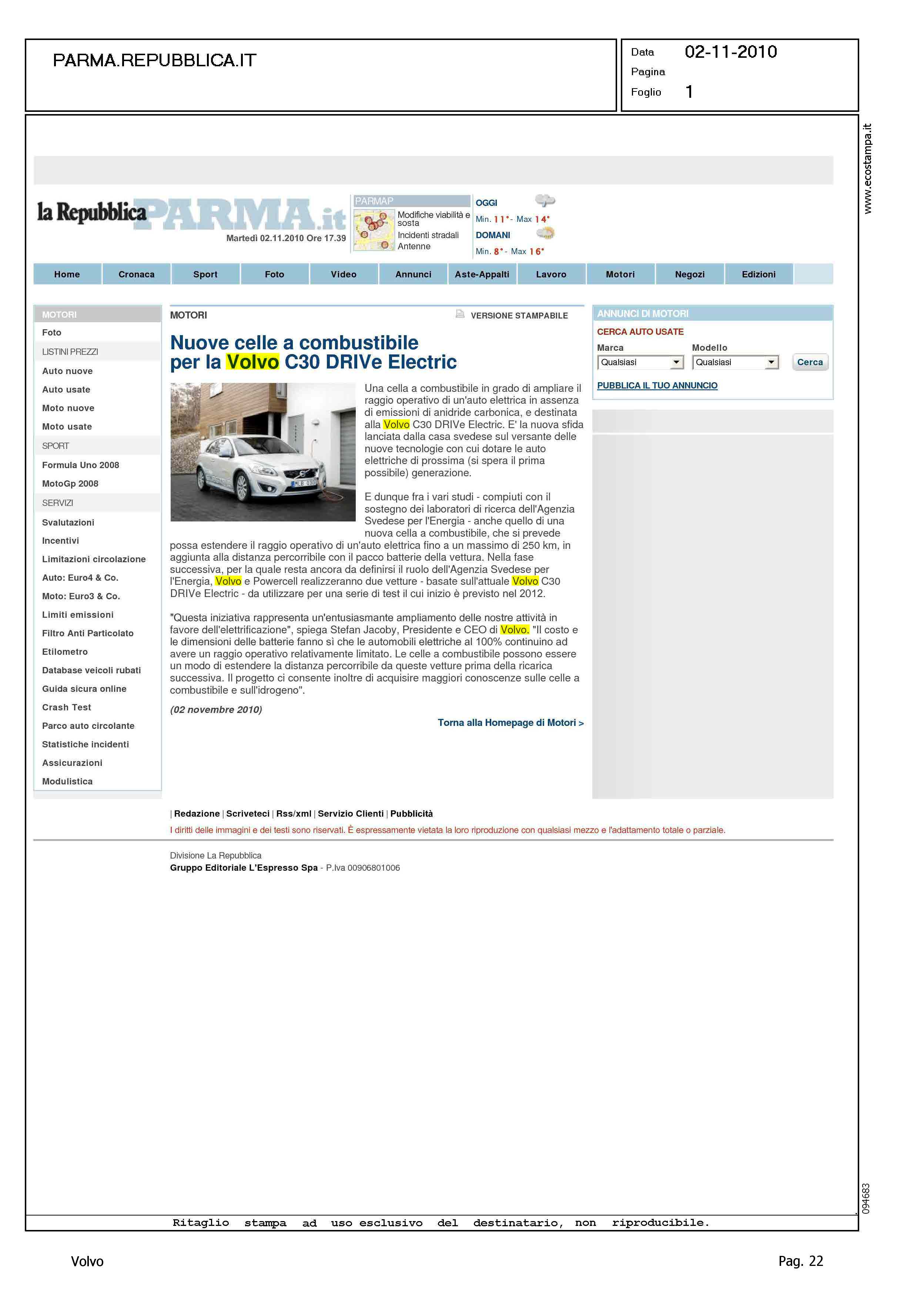 Highlight: (EDIZIONE PARMA) - SWEDISH ENERGY AGENCY - JACOBY SU PROGETTO C30 BEV - POWERCELL SWEDEN AB - SVILUPPO AUTONOMIA A 250 KM