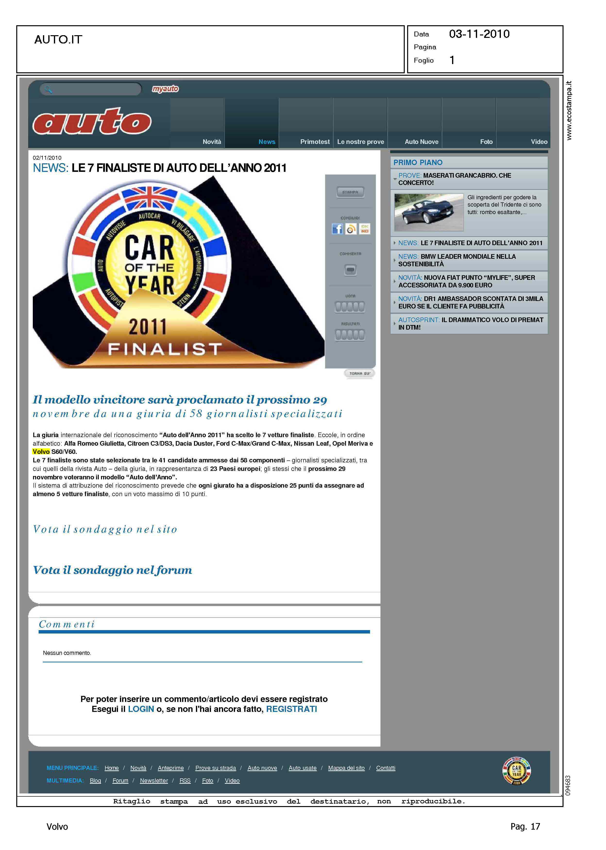 Author: Line: Corporate Model: Corporate Subject: - Title: NEWS: LE 7 FINALISTE DI AUTO DELL'ANNO 2011Highlight: AUTO DELL'ANNO 2011 - FINALISTE - VOLVO S60/V60