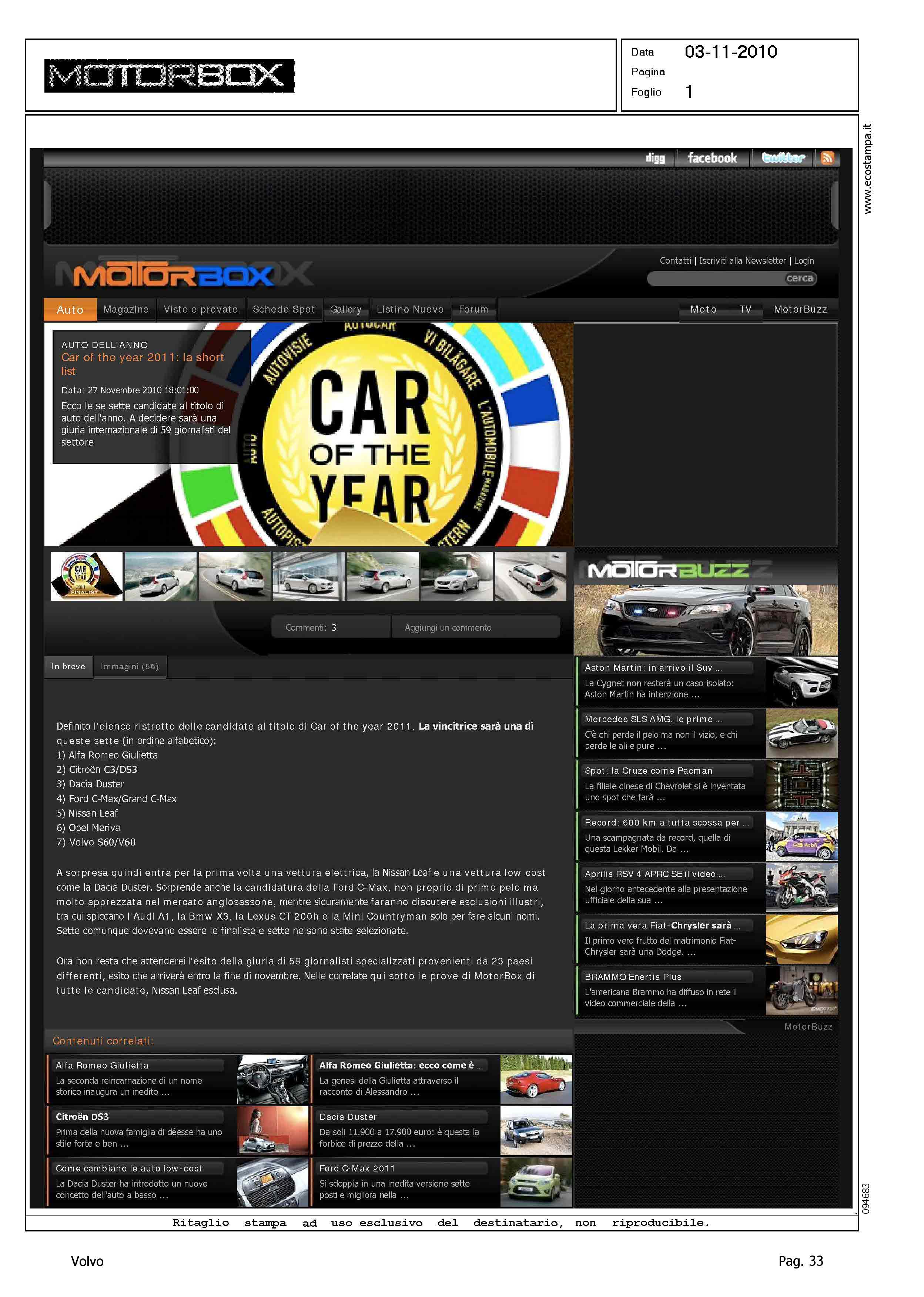 Author: Line: Corporate Model: Corporate Subject: - Title: CAR OF THE YEAR 2011: LA SHORT LISTHighlight: AUTO DELL'ANNO 2011 - FINALISTE - VOLVO S60/V60