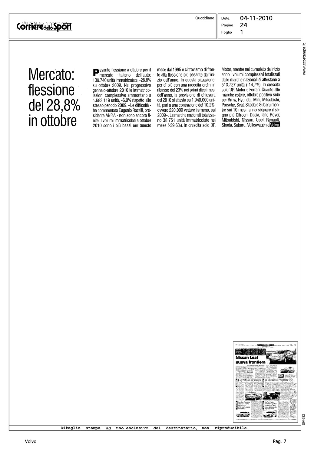 Author: Line: Corporate Model: Corporate Subject: - Title: MERCATO: FLESSIONE DEL 28,8% IN OTTOBREHighlight: MERCATO ITALIA - POSIZIONE VOLVO