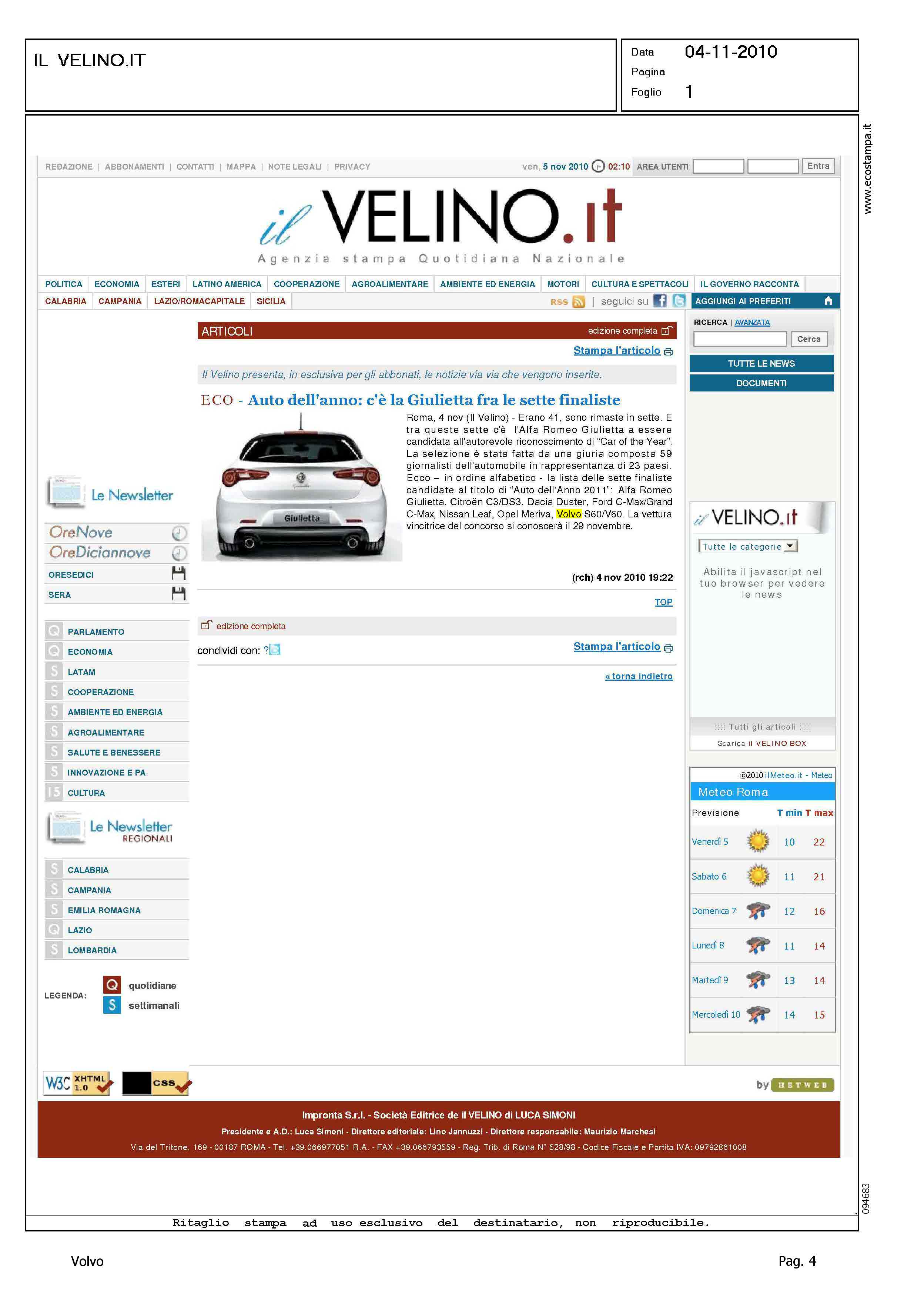Author: Line: Corporate Model: Corporate Subject: - Title: ECO - AUTO DELL'ANNO: C'E' LA GIULIETTA FRA LE SETTE FINALISTEHighlight: AUTO DELL'ANNO 2011 - FINALISTE - VOLVO S60/V60