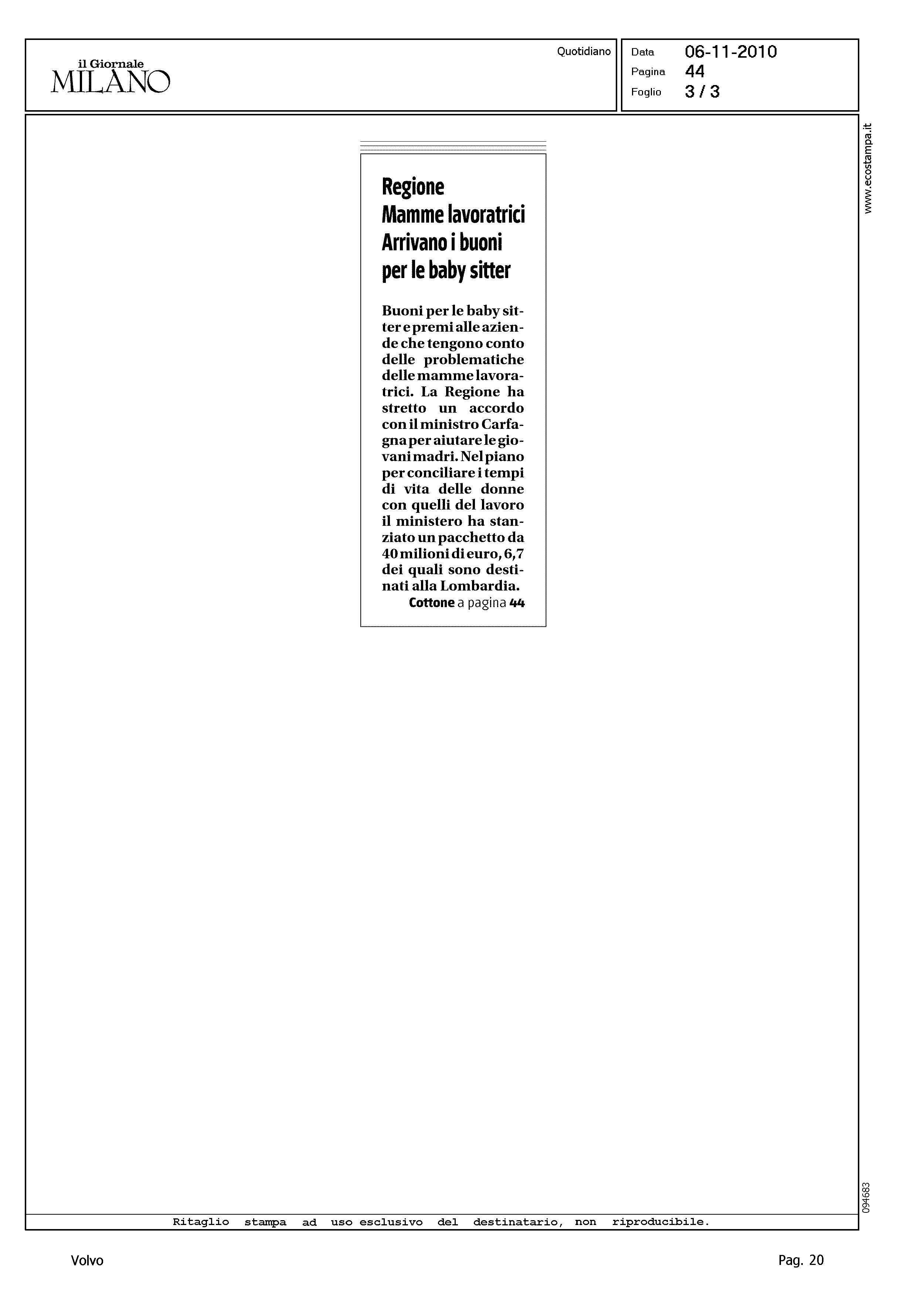 Author: COTTONE, SABRINALine: Corporate Model: Corporate Subject: - Title: BUONI ALLE BABY SITTER E PREMI ALLE AZIENDE PER AIUTARE LE DONNEHighlight: (EDIZIONE MILANO) - SVEZIA - VOLVO - FLESSIBILITA' ORARIO