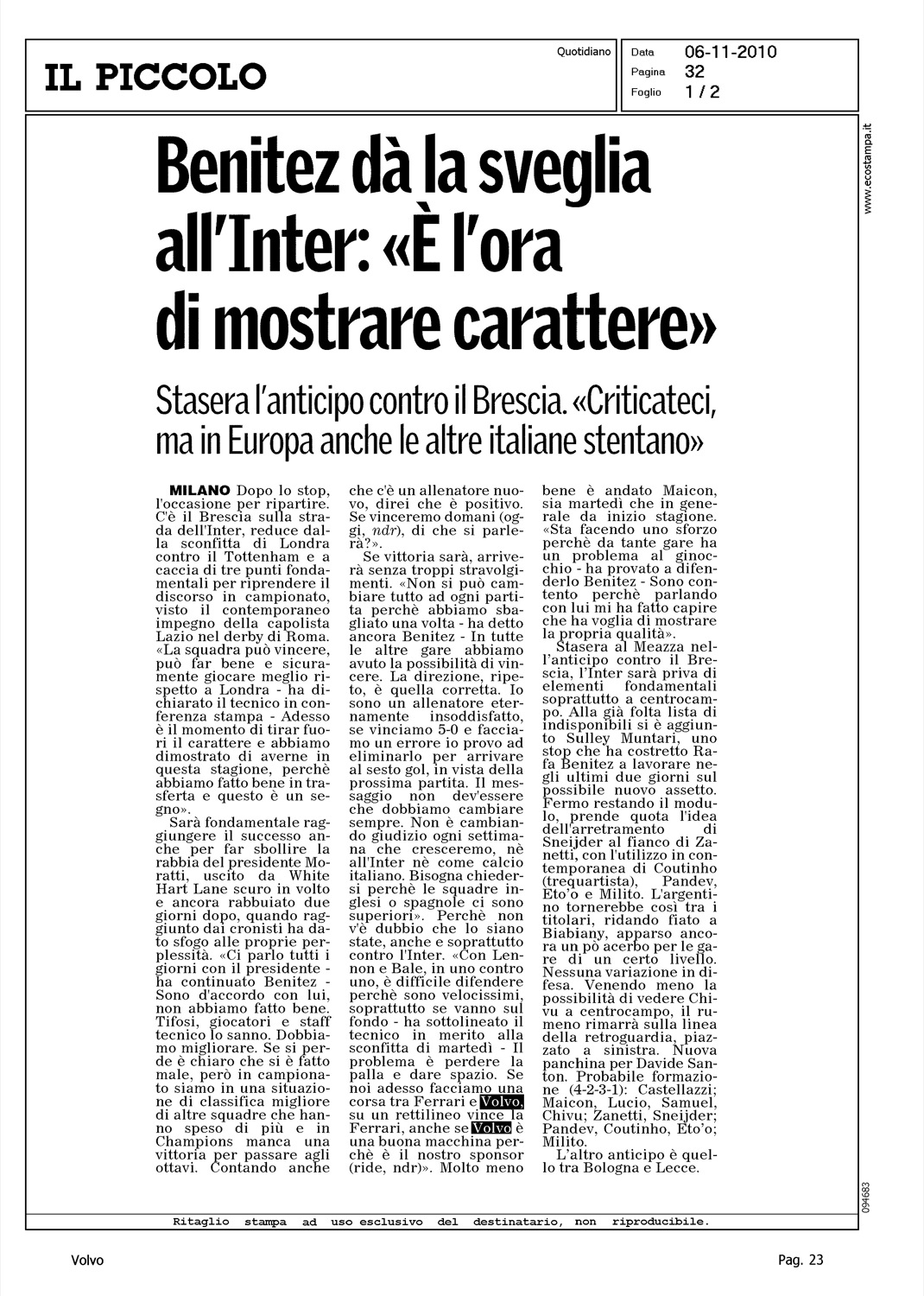 Author: Line: Corporate Model: Corporate Subject: - Title: BENITEZ DA' LA SVEGLIA ALL'INTER: ''E' L'ORA DI MOSTRARE CARATTERE''Highlight: DICHIARAZIONE BENITEZ