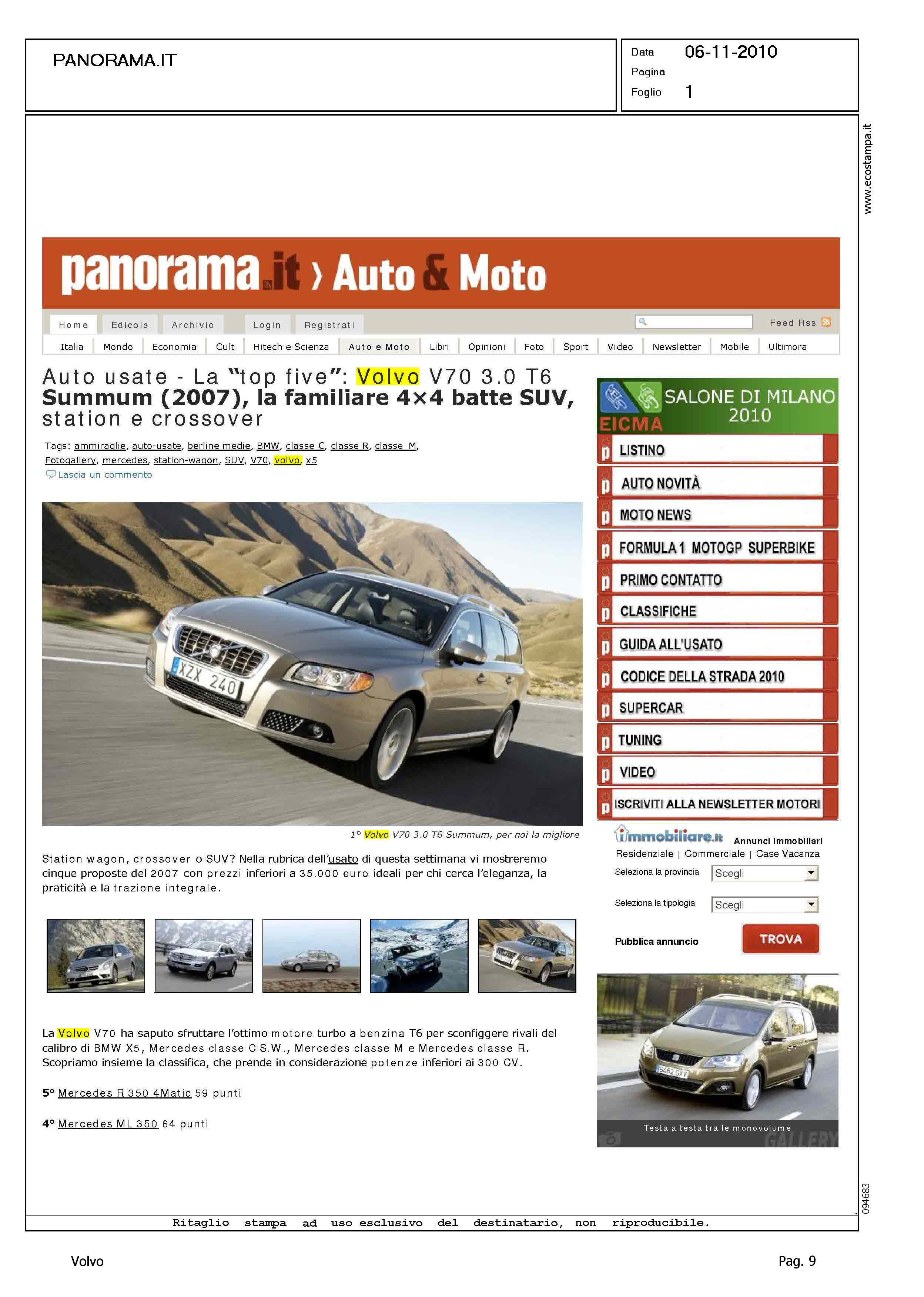 Title: AUTO USATE - LA ''TOP FIVE'': VOLVO V70 3.0 T6 SUMMUM (2007), LA FAMILIARE 4X4 BATTE SUV, STATION E CROSSOVER