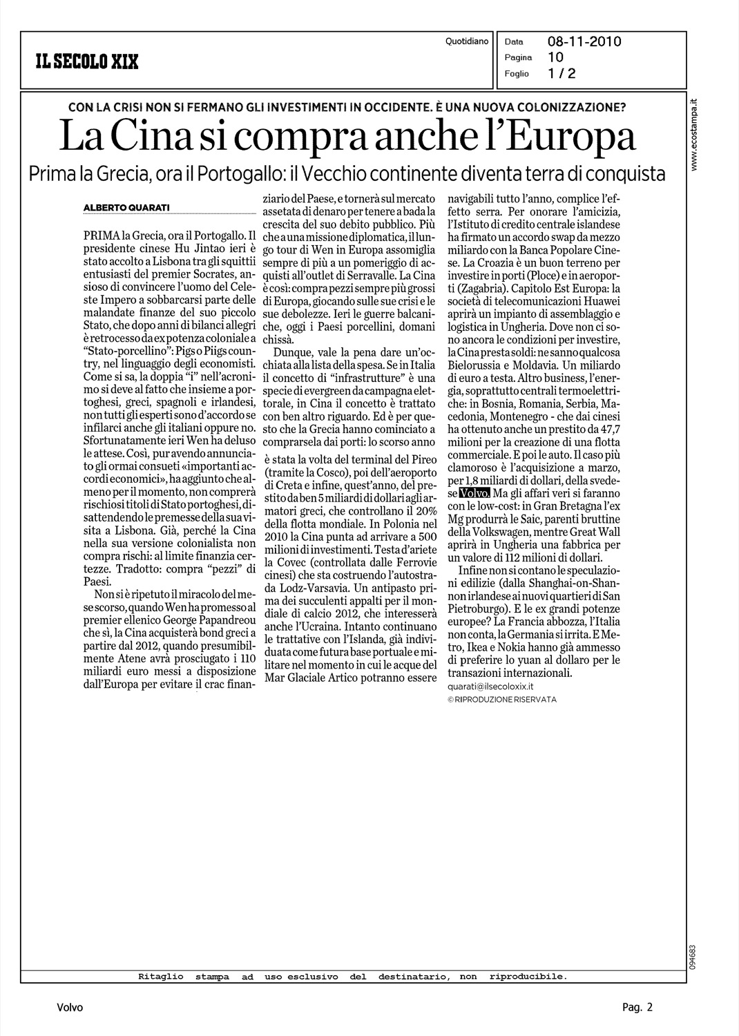 Author: QUARATI, ALBERTOLine: Corporate Model: Corporate Subject: - Title: LA CINA SI COMPRA ANCHE L'EUROPAHighlight: VOLVO - GEELY