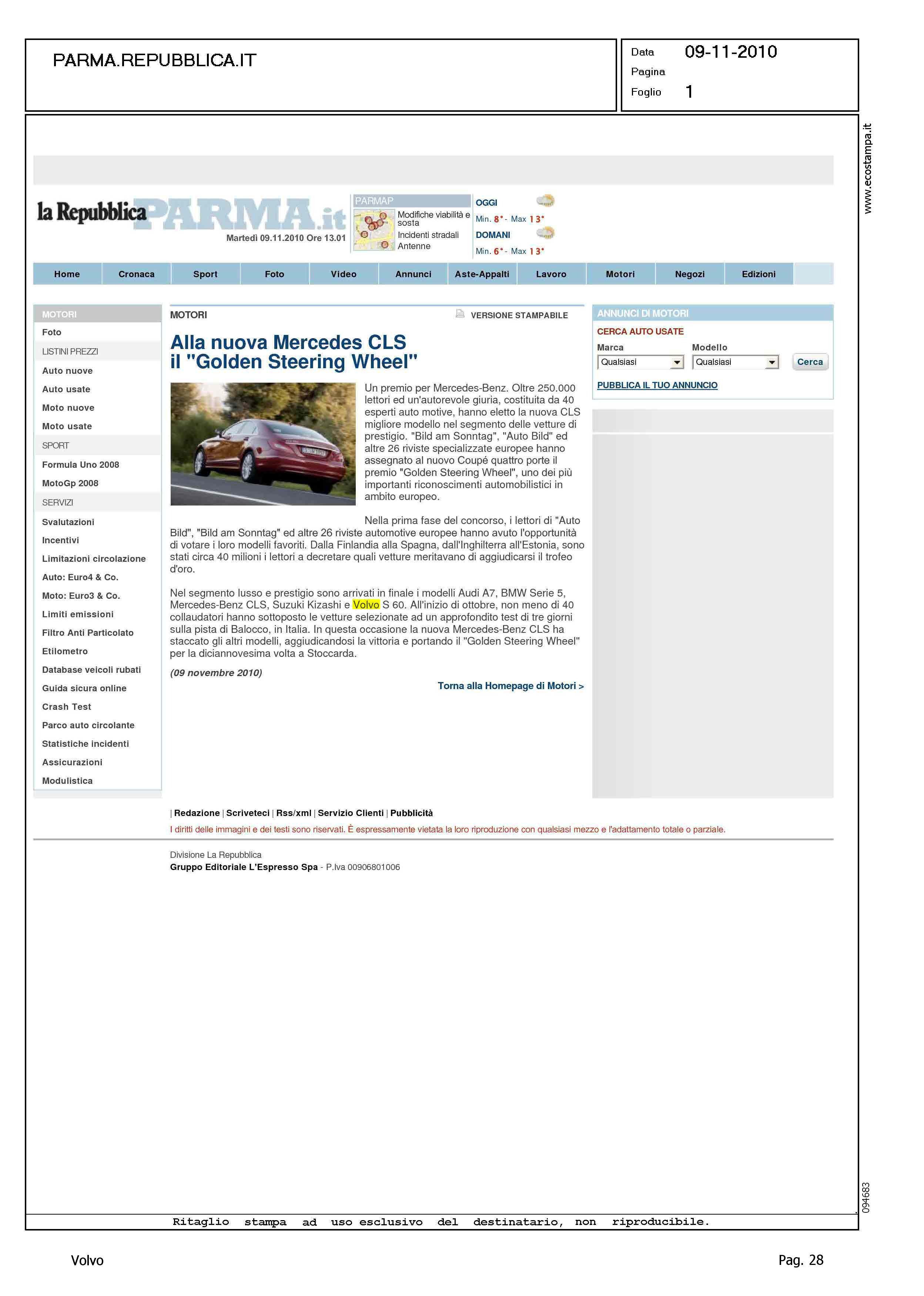 Author: Line: Corporate Model: Corporate Subject: - Title: ALLA NUOVA MERCEDES CLS IL ''GOLDEN STEERING WHEEL''Highlight: (EDIZIONE PARMA) - GOLDEN STEERING WHEEL - POSIZIONE VOLVO