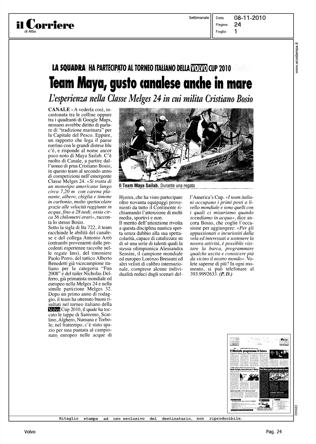 Author: Line: Corporate Model: Corporate Subject: Volvo Cup Title: TEAM MAYA, GUSTO CANALESE ANCHE IN MAREHighlight: TEAM MAYA