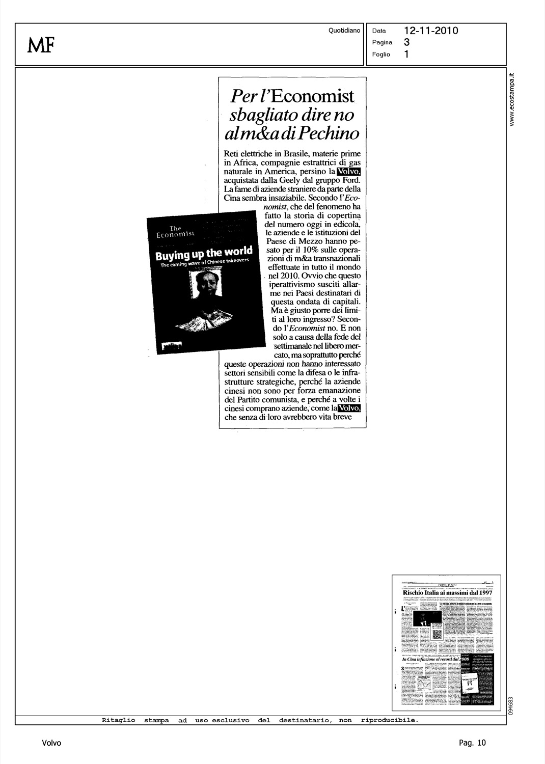 Author: Line: Corporate Model: Corporate Subject: - Title: PER L'ECONOMIST SBAGLIATO DIRE NO AL M&A DI PECHINOHighlight: VOLVO - GEELY