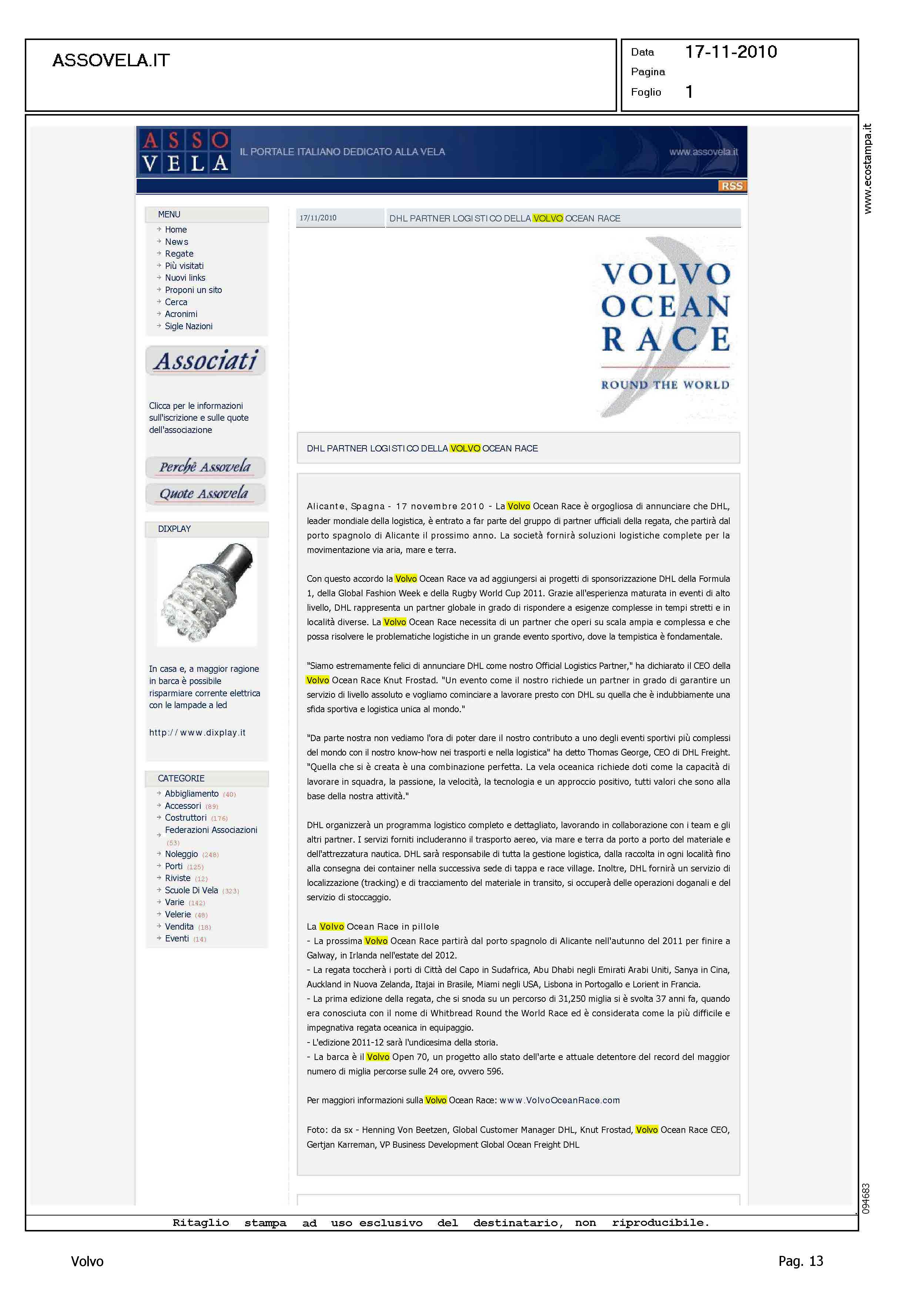 Author: Line: Corporate Model: Corporate Subject: Volvo Ocean Race Title: DHL PARTNER LOGISTICO DELLA VOLVO OCEAN RACEHighlight: DHL PARTNER VOLVO OCEAN RACE