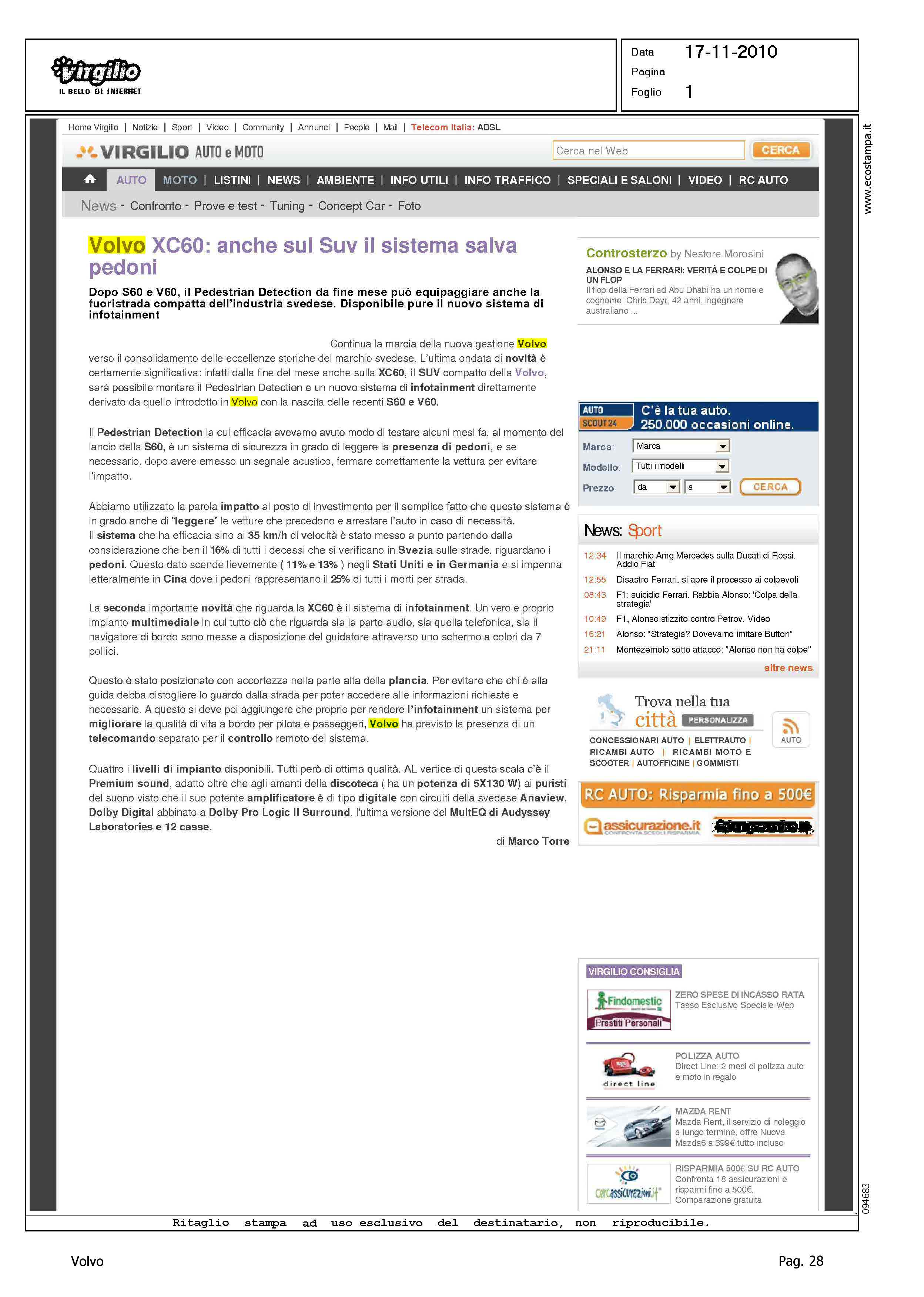 Author: Line: XC60 Model: Subject: - Title: VOLVO XC60: ANCHE SUL SUV IL SISTEMA SALVA PEDONIHighlight: SICUREZZA - CITY SAFETY - PEDESTRIAN DETECTION - ACCESSORI - INFOTAINMENT