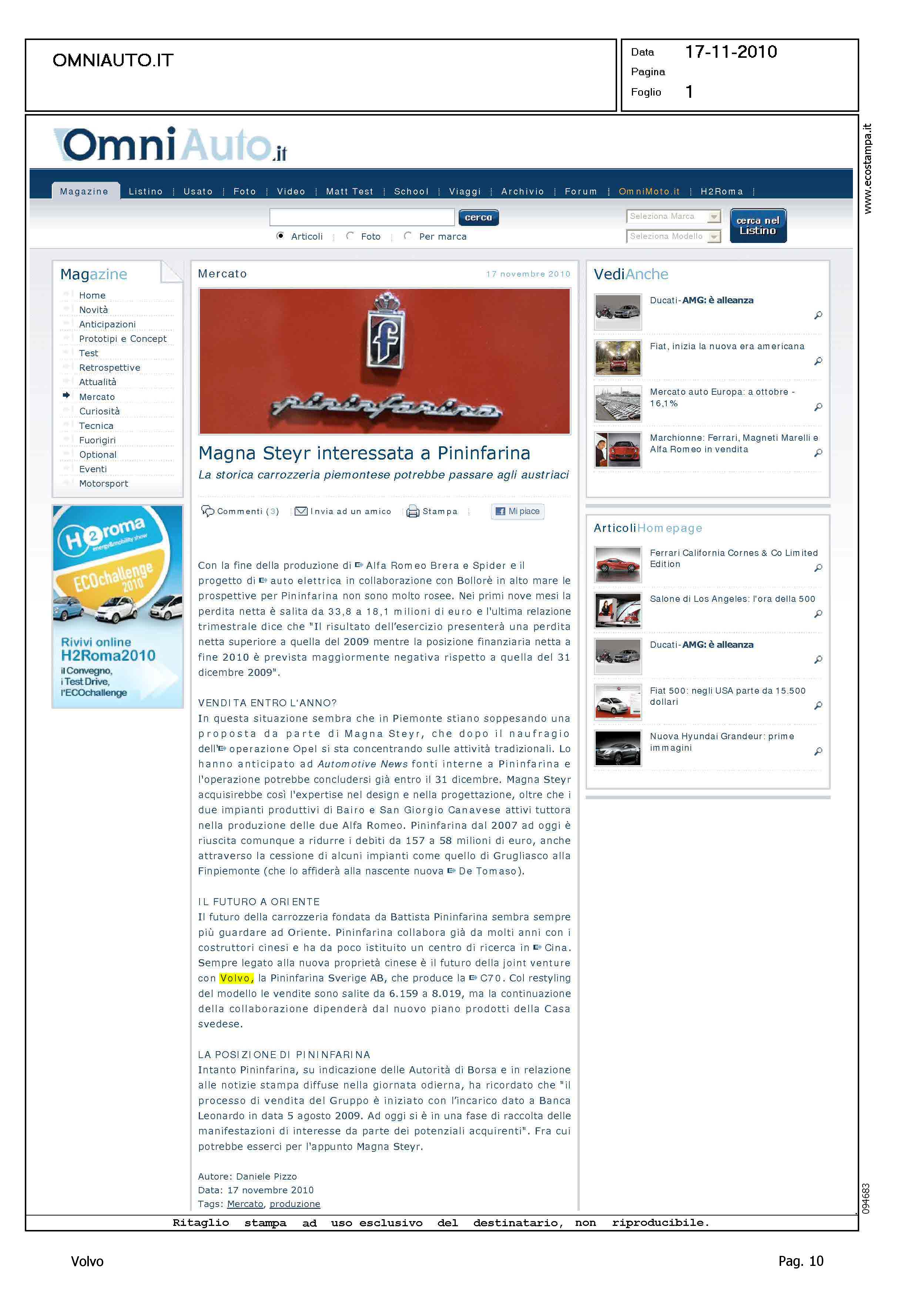 Author: Line: Corporate Model: Corporate Subject: - Title: MAGNA STEYR INTERESSATA A PININFARINAHighlight: MAGNA - PININFARINA - QUOTAZIONE BORSA - VOLVO C70 CONVERTIBLE