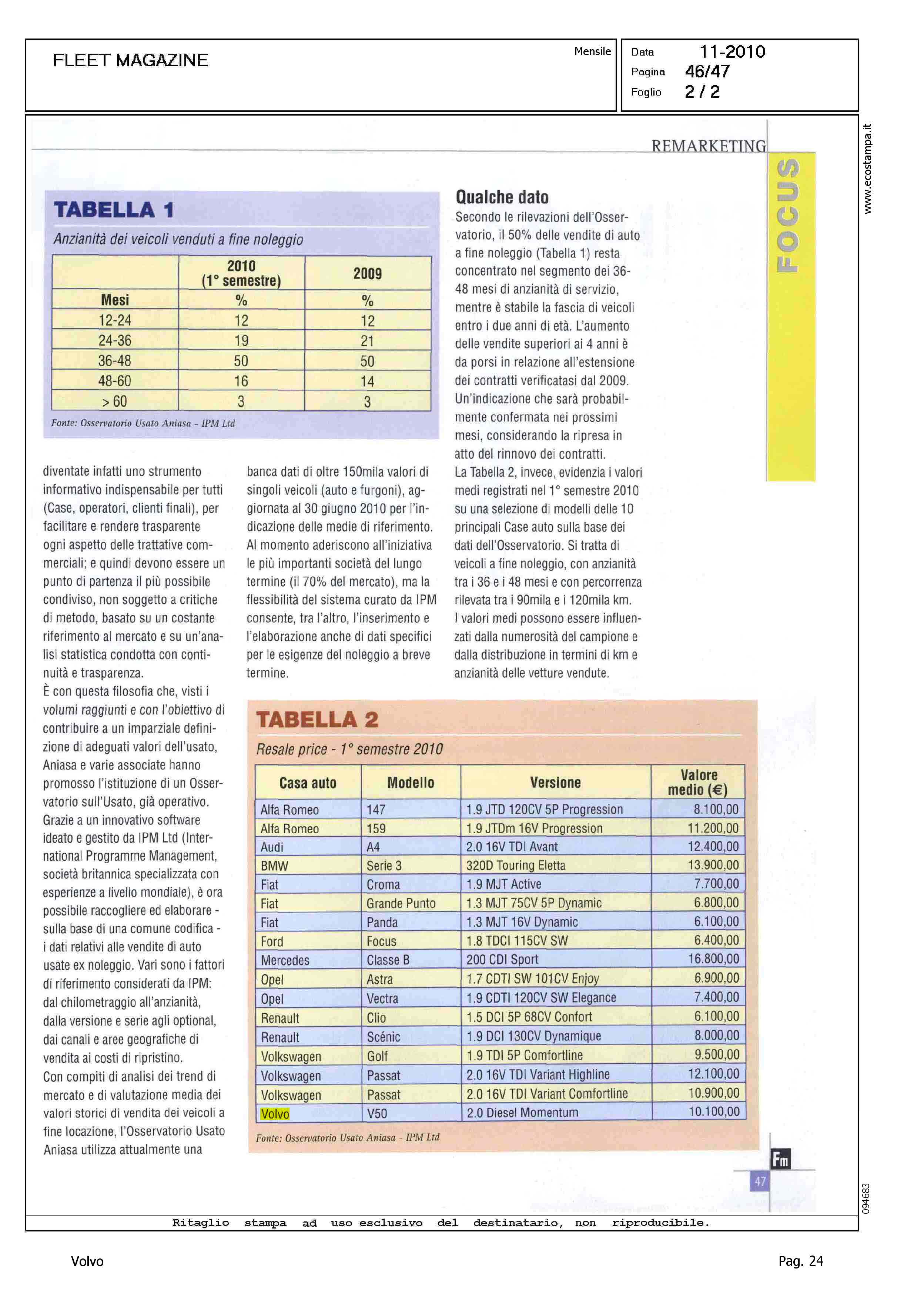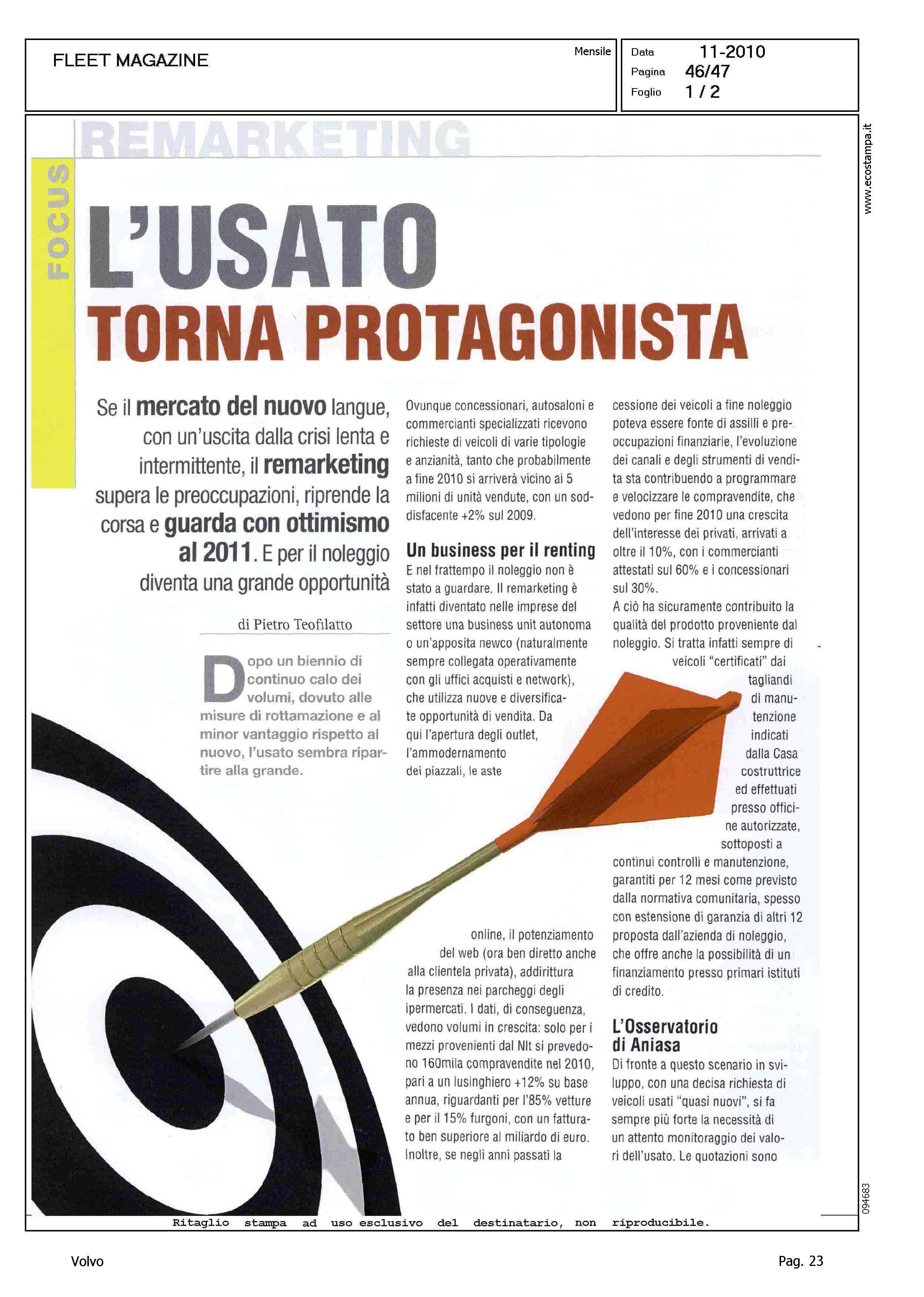 Author: TEOFILATTO, PIETROLine: Corporate Model: Corporate Subject: - Title: L'USATO TORNA PROTAGONISTAHighlight: MERCATO USATO - TABELLE - POSIZIONE VOLVO