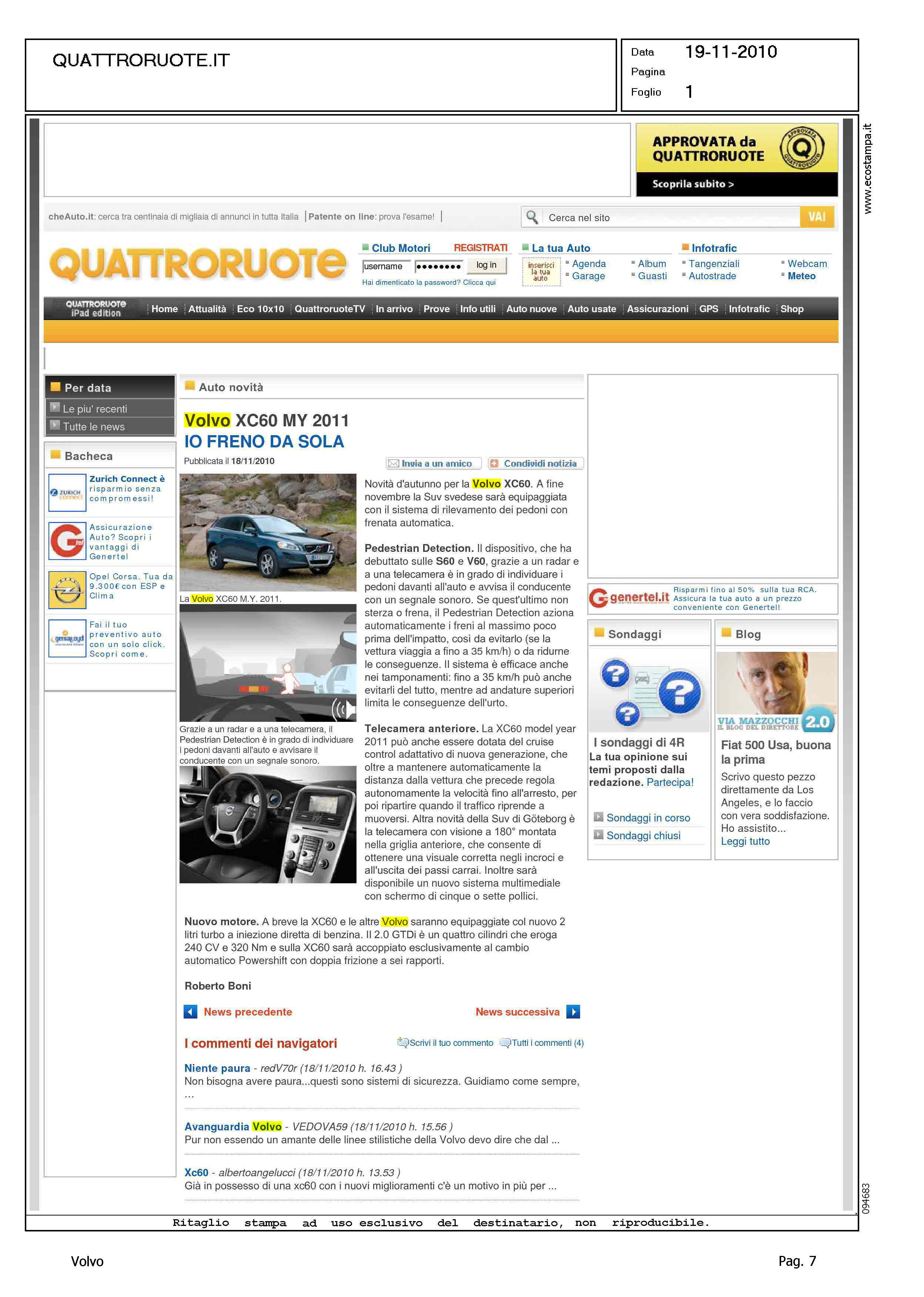 Author: Line: XC60 Model: Subject: - Title: VOLVO XC60 MY 2011 - IO FRENO DA SOLAHighlight: SICUREZZA - CITY SAFETY - PEDESTRIAN DETECTION - ACCESSORI - INFOTAINMENT