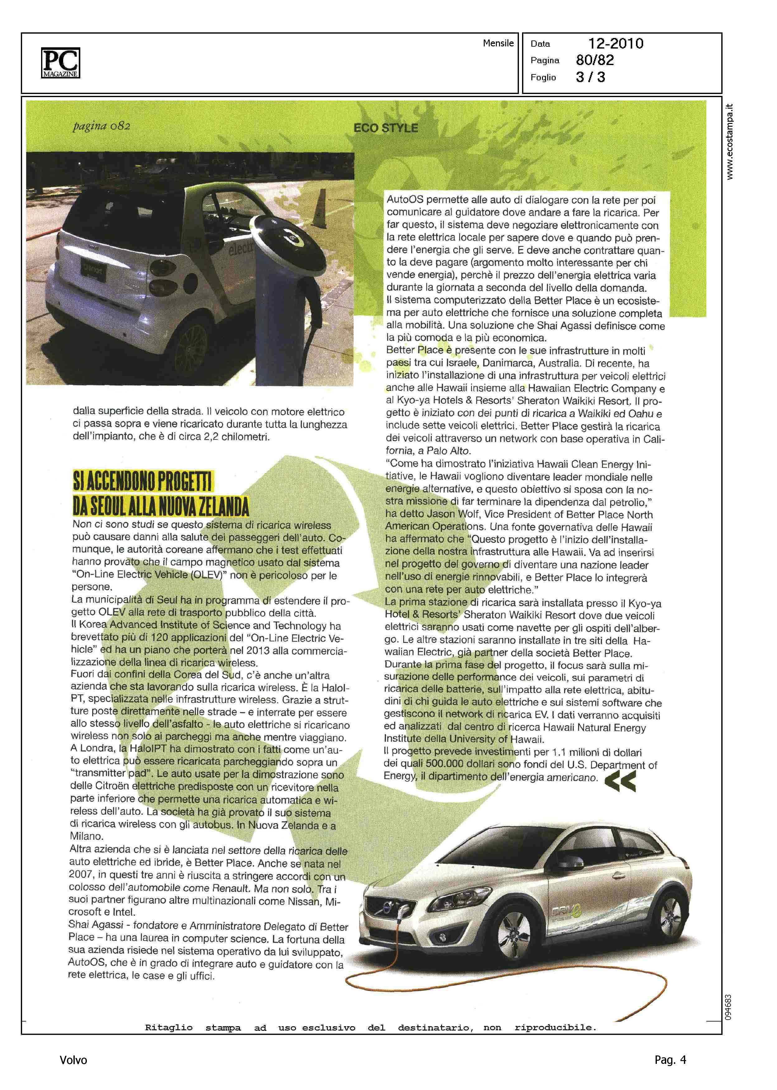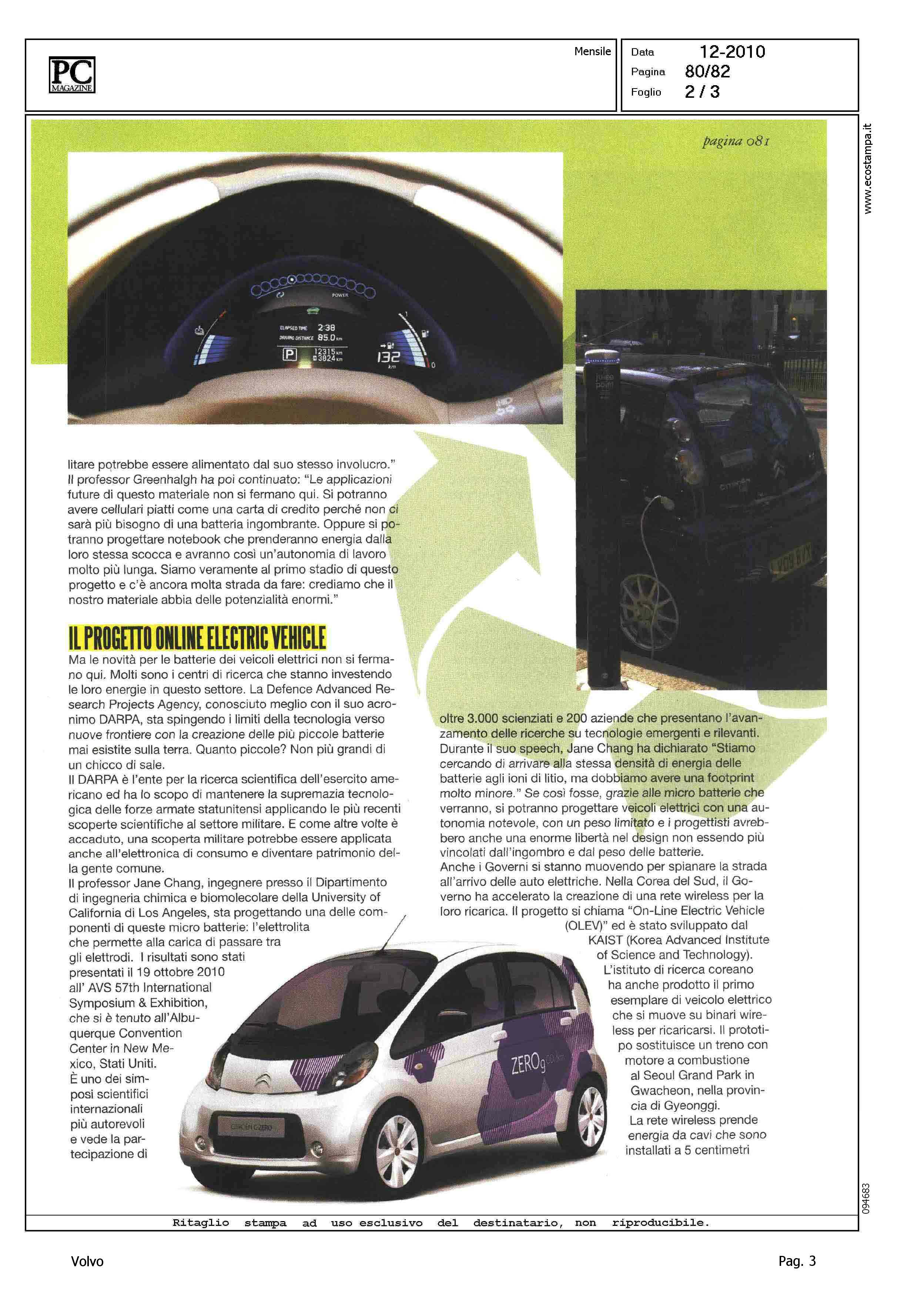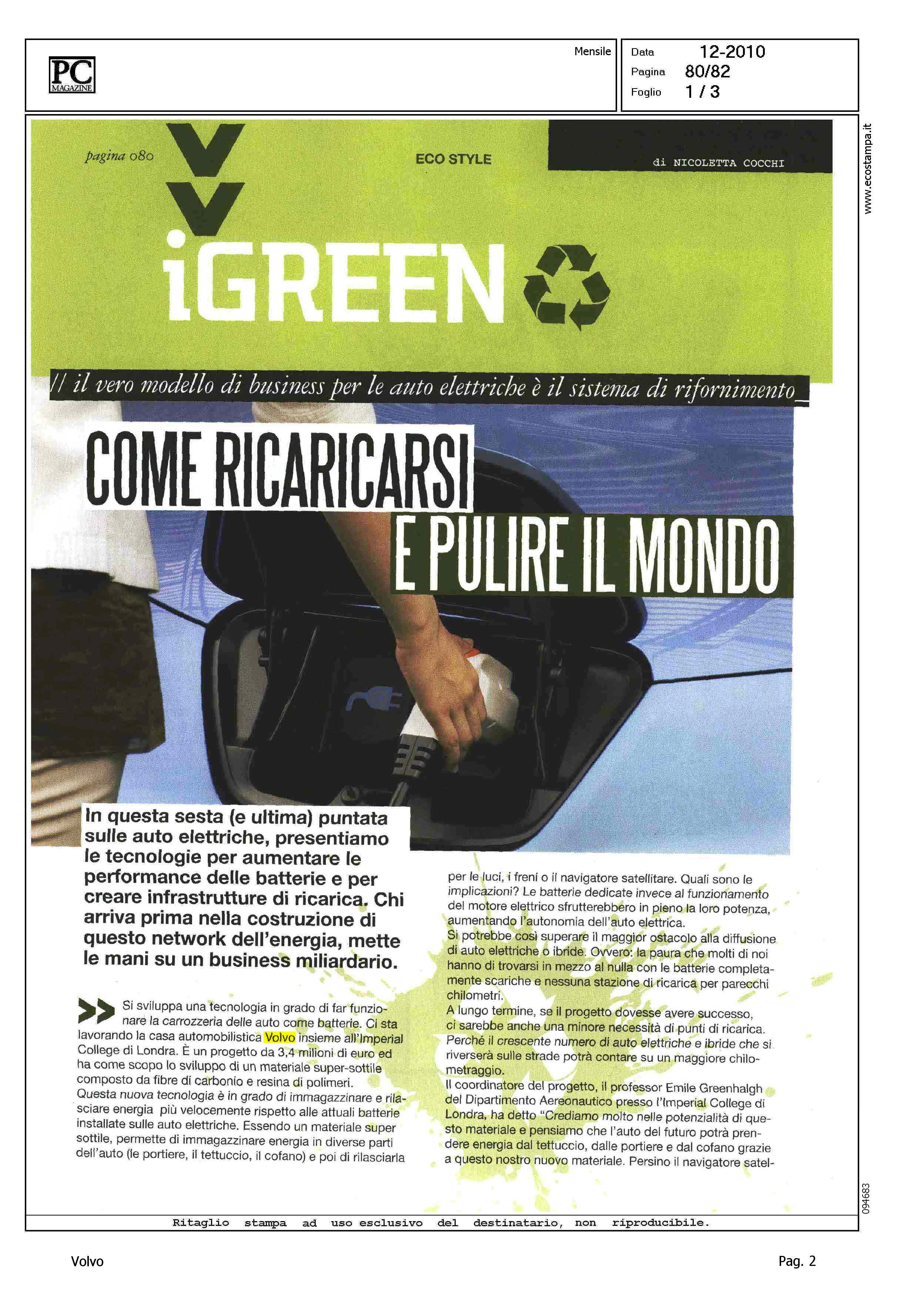 Author: COCCHI, NICOLETTALine: Corporate Model: Volvo C30 Subject: - Title: COME RICARICARSI E PULIRE IL MONDOHighlight: PROGETTO IMPERIAL COLLEGE, LONDRA - SVILUPPO AUTO ELETTRICA - CARROZZERIA - BATTERIE