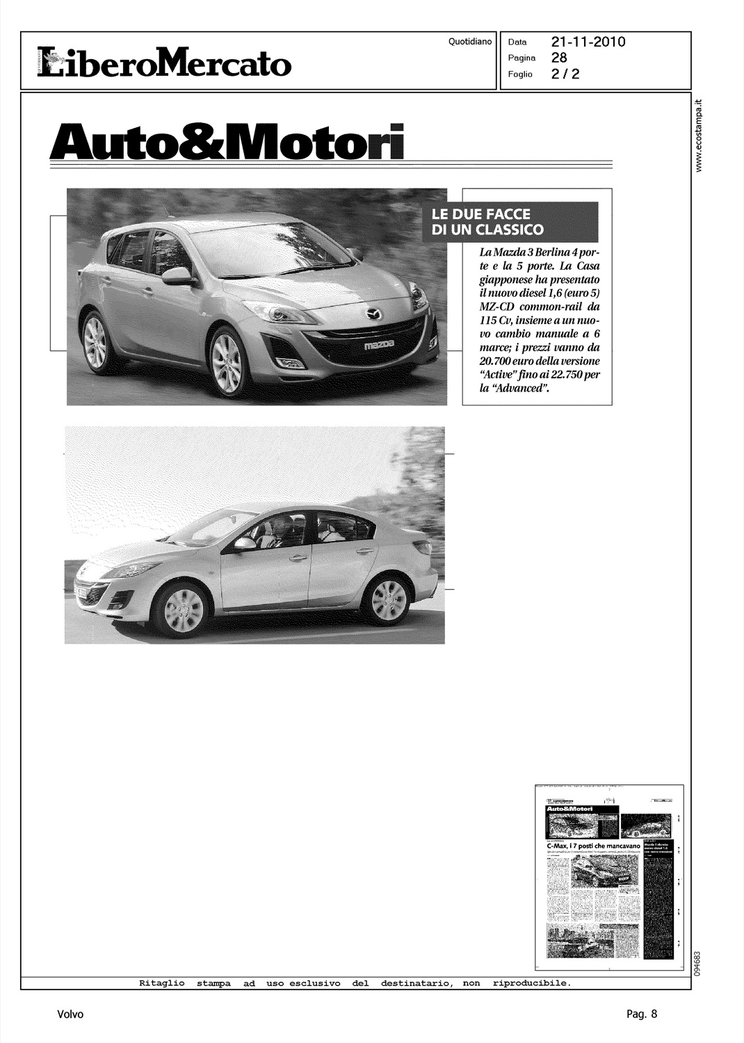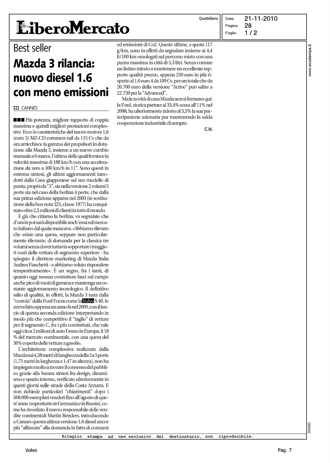 Author: Line: Corporate Model: Volvo S40 - V50 Subject: - Title: MAZDA RILANCIA: NUOVO DIESEL 1.6 CON MENO EMISSIONIHighlight: VOLVO S40 - MAZDA 3 1.6