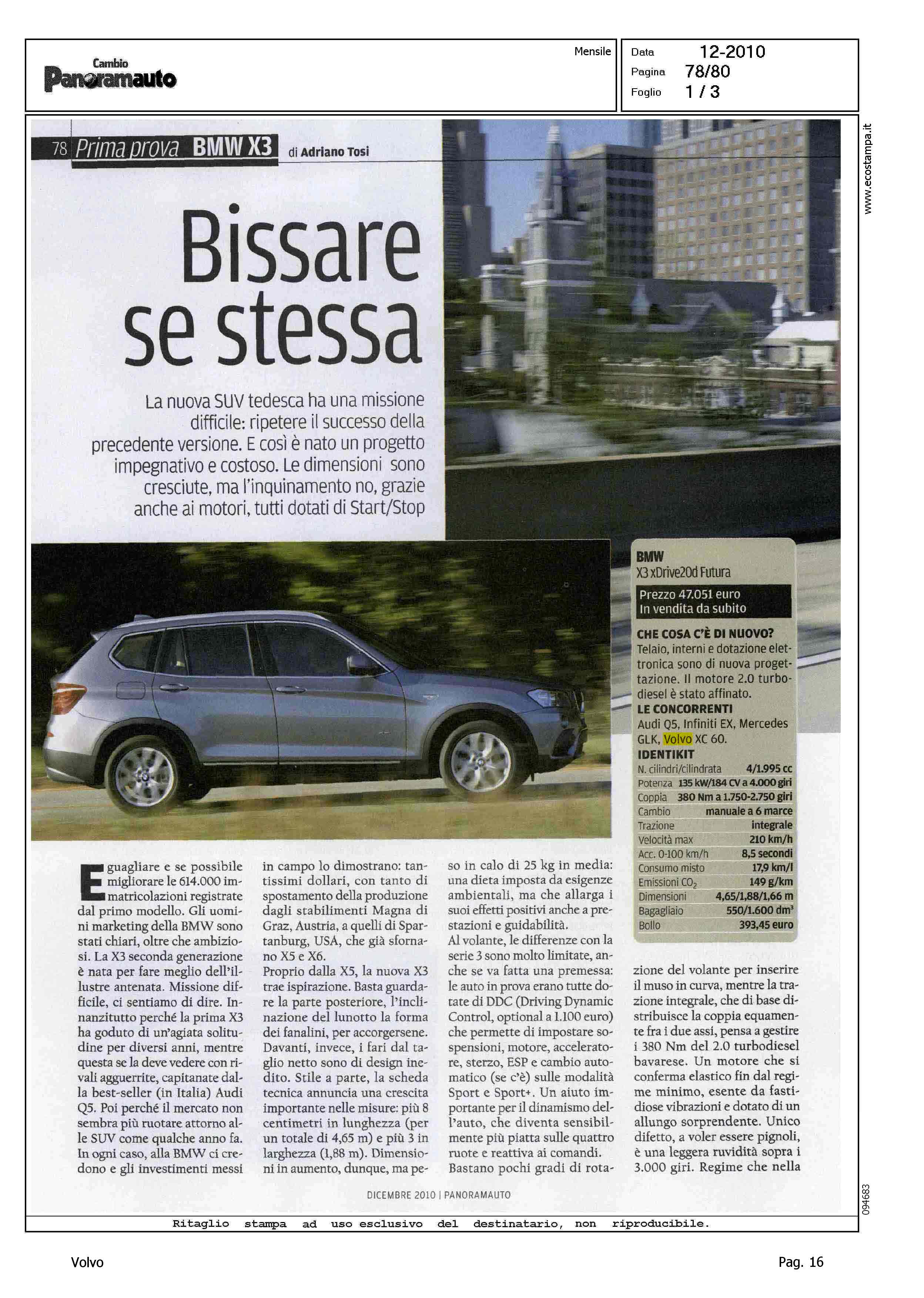 Author: TOSI, ADRIANOLine: Corporate Model: Corporate Subject: - Title: BISSARE SE STESSAHighlight: (USCITA DICEMBRE) - VOLVO XC60 - COMPETITOR VS BMW X3