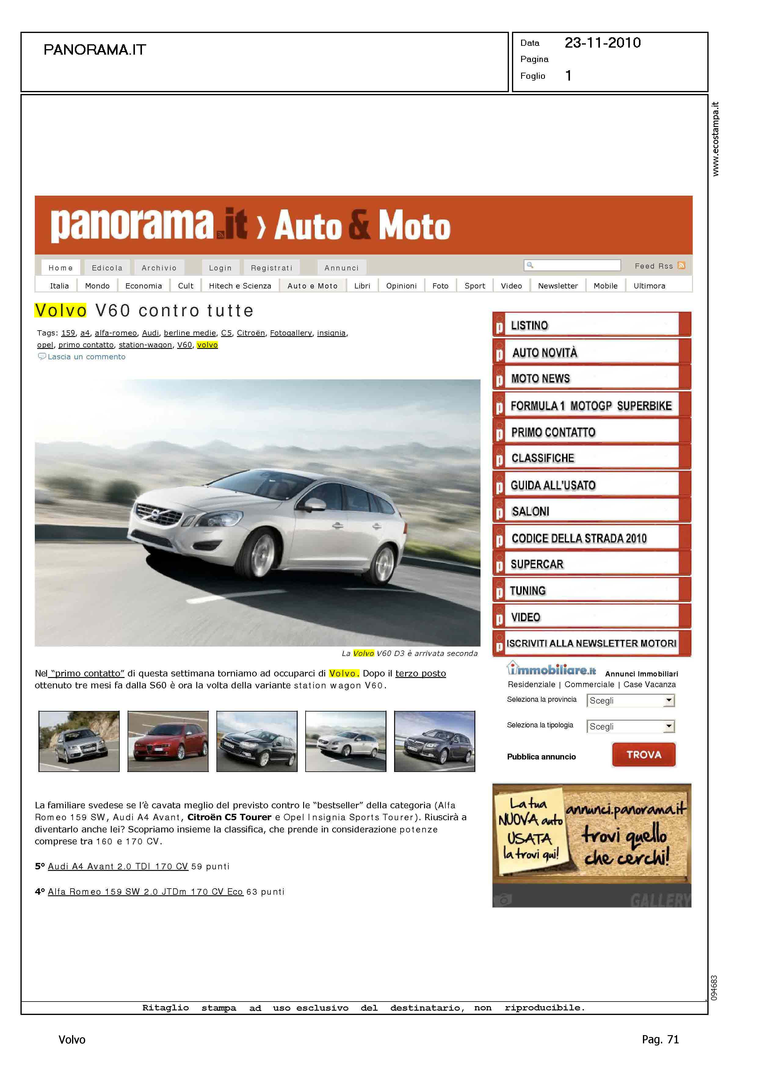 Highlight: CLASSIFICA STATION WAGON - VOLVO V60, 3/5 - COMPETITOR, ALFA 159 SW - AUDI A4 AVANT - CITROEN C5 TOURER - OPEL INSIGNIA SPORT TOURER (CLASSIFICA INCOMPLETA, NON DISPONIBILE)
