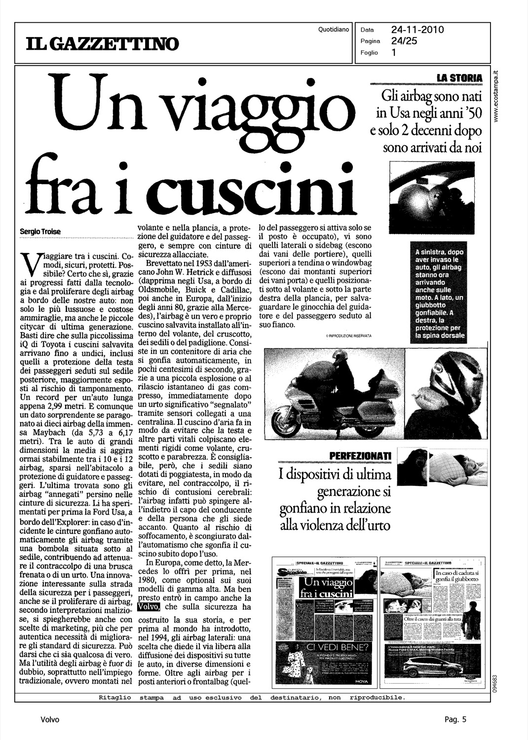 Author: TROISE, SERGIOLine: Corporate Model: Corporate Subject: - Title: UN VIAGGIO FRA I CUSCINIHighlight: SICUREZZA - VALORE VOLVO