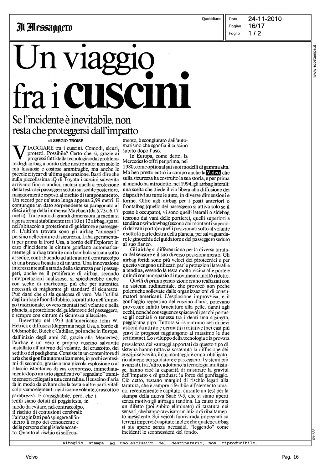 Author: TROISE, SERGIOLine: Corporate Model: Corporate Subject: - Title: UN VIAGGIO FRA I CUSCINIHighlight: SICUREZZA - VALORE VOLVO