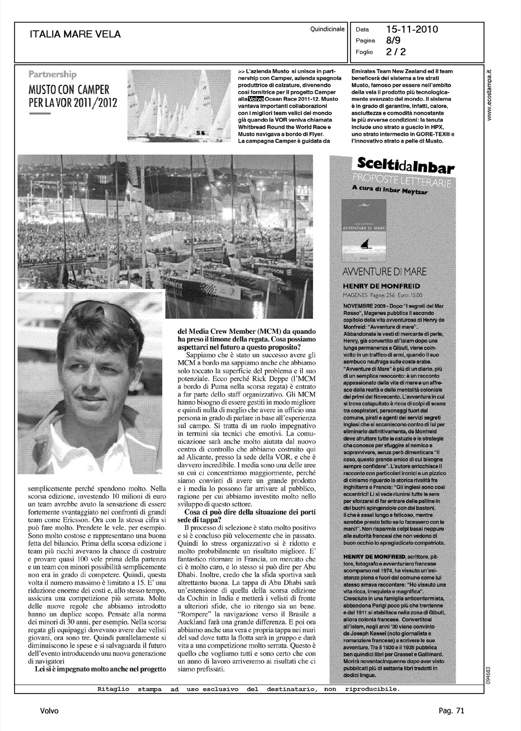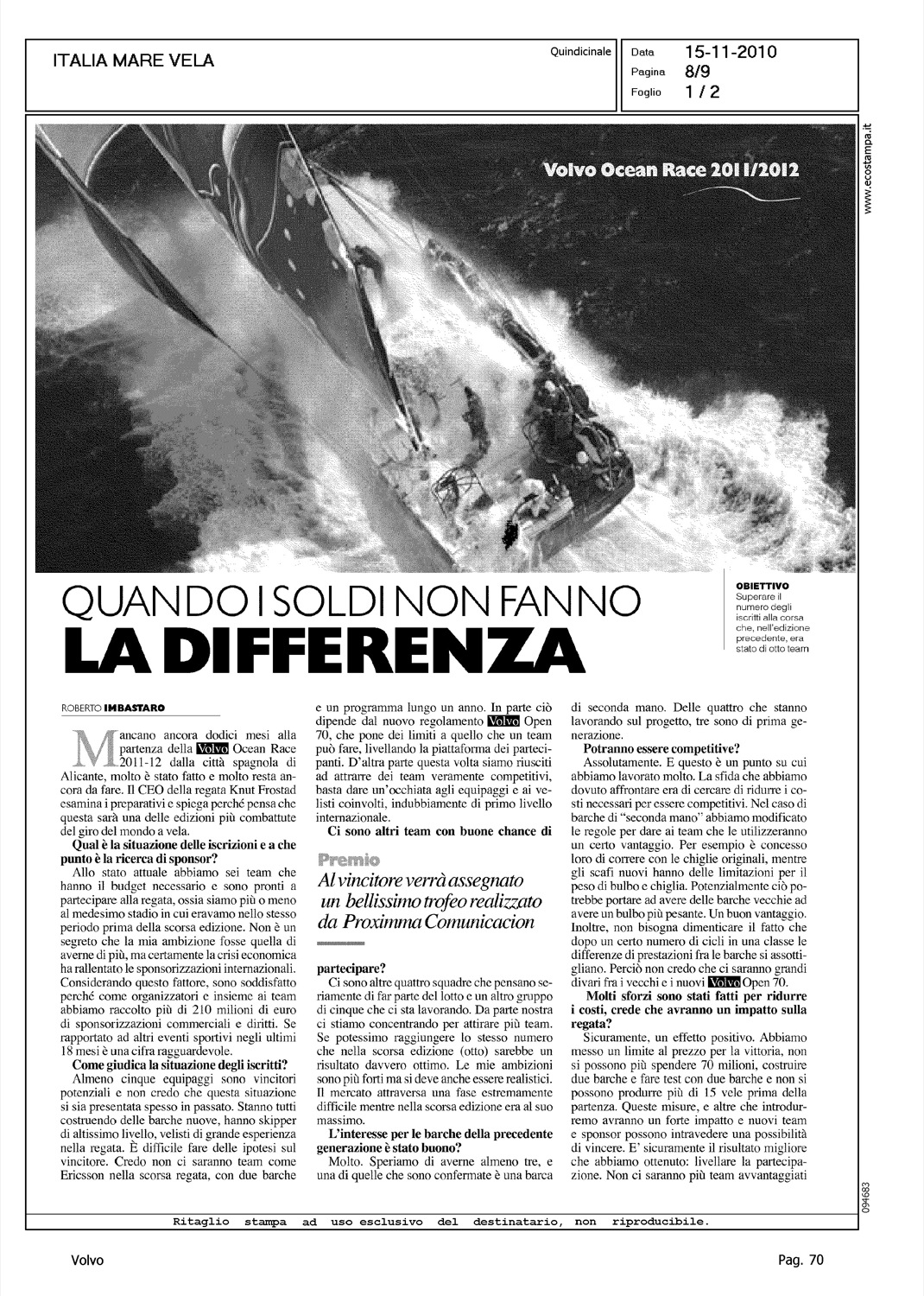 Author: IMBASTARO, ROBERTOLine: Corporate Model: Corporate Subject: Volvo Ocean Race Title: QUANDO I SOLDI NON FANNO LA DIFFERENZAHighlight: FROSTAD, INTERVISTA - REGATA 2011-12