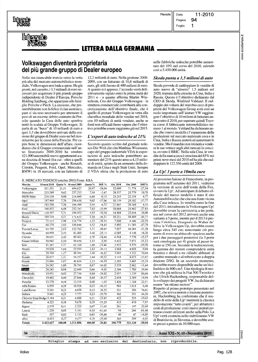 Author: Line: Corporate Model: Corporate Subject: - Title: VOLKSWAGEN DIVENTERA' PROPRIETARIA DEL PIU' GRANDE GRUPPO DI DEALER EUROPEOHighlight: MERCATO GERMANIA - TABELLE - POSIZIONE VOLVO
