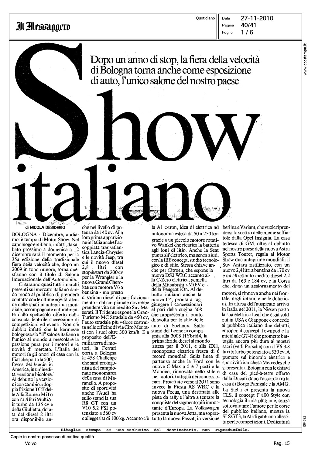 Author: DESIDERIO, NICOLALine: Corporate Model: Corporate Subject: - Title: SHOW ITALIANOHighlight: MOTORSHOW BOLOGNA - BRAND PRESENTI - VOLVO - GEELY - S60/V60 - R DESIGN