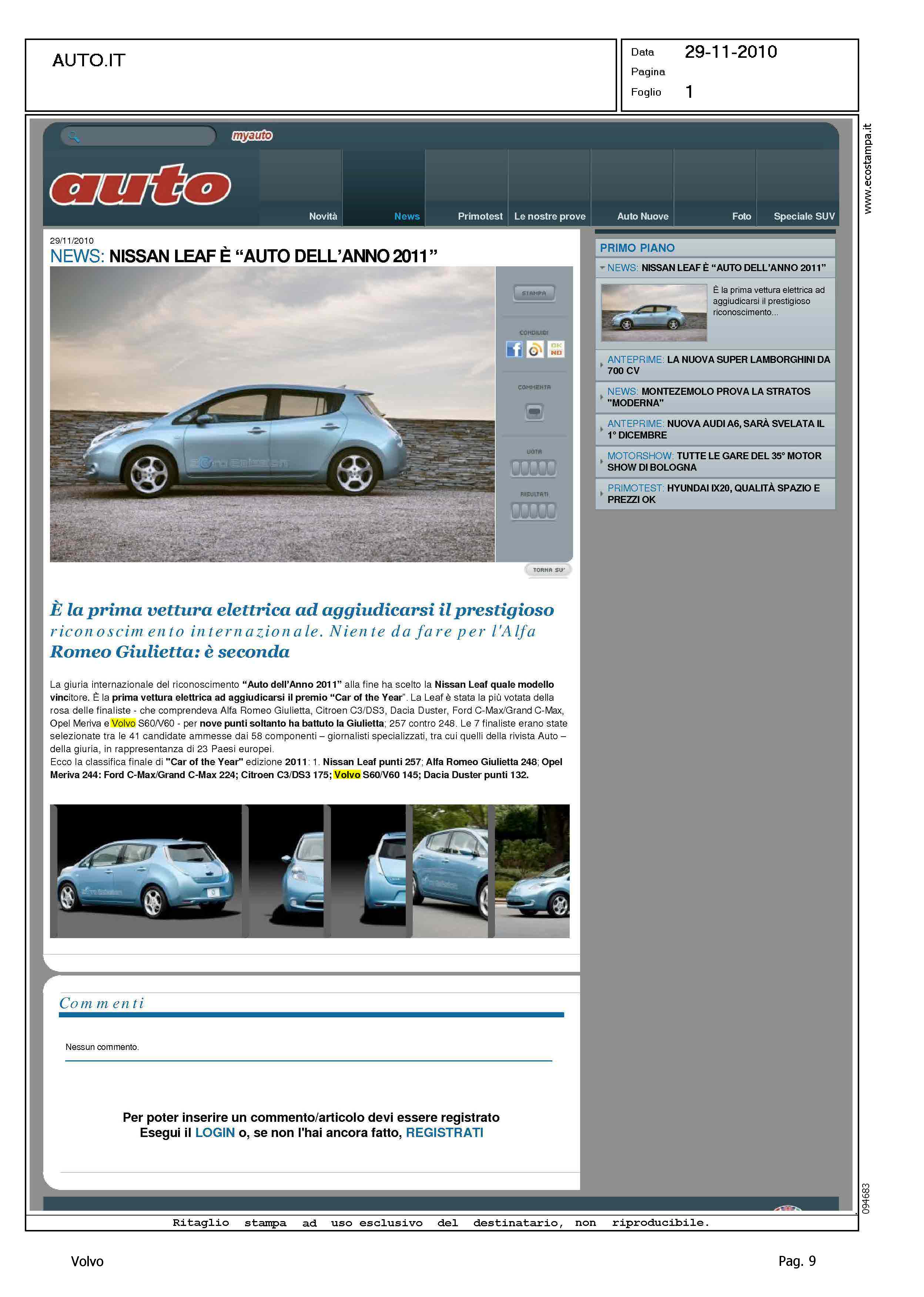 Author: Line: Corporate Model: Corporate Subject: - Title: NEWS: NISSAN LEAF E' ''AUTO DELL'ANNO 2011''Highlight: ELETTA L'AUTO DELL'ANNO 2011 - VOLVO S60/V60, 6/145 PUNTI
