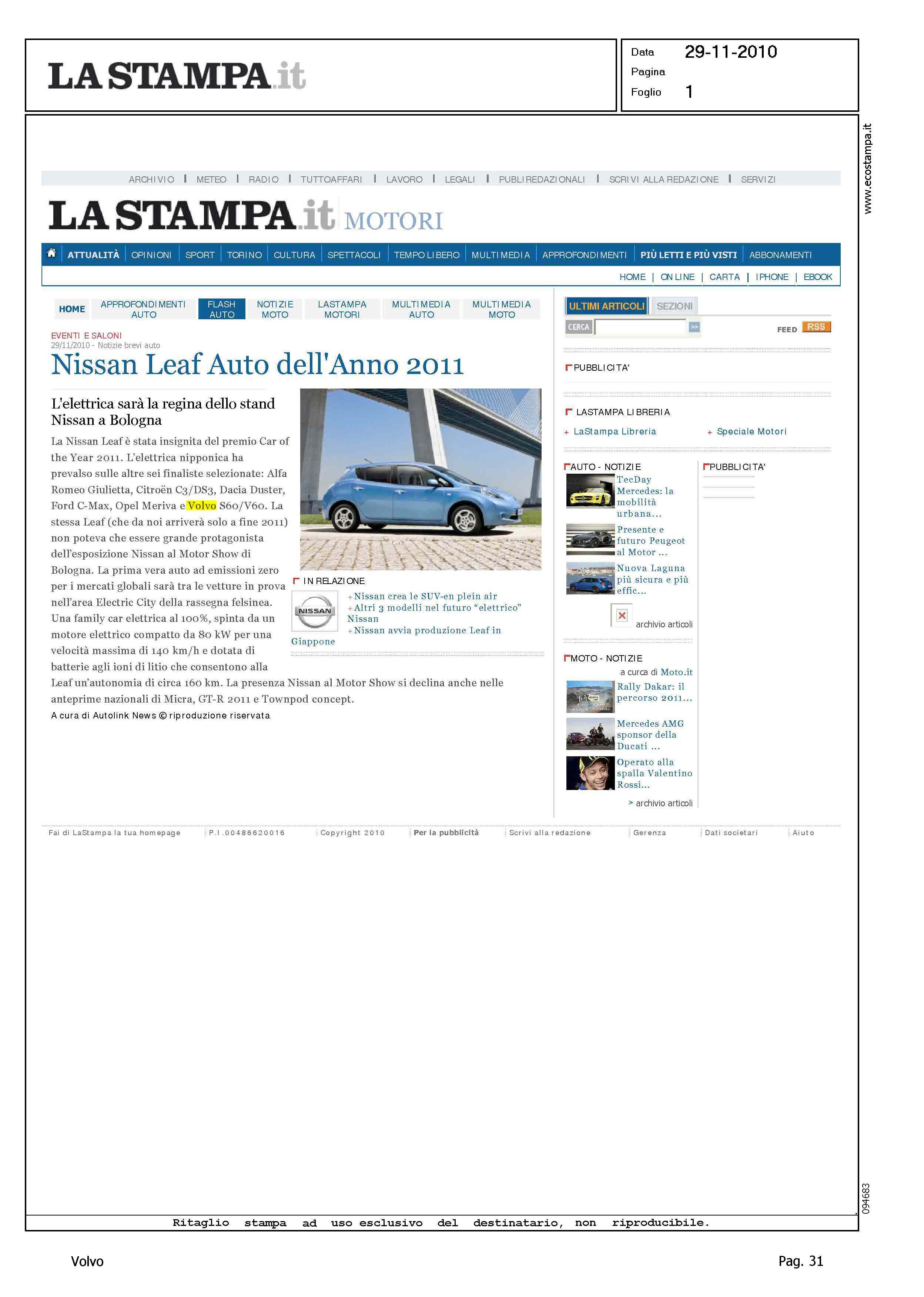 Author: Line: Corporate Model: Corporate Subject: - Title: NISSAN LEAF AUTO DELL'ANNO 2011Highlight: ELETTA L'AUTO DELL'ANNO 2011 - VOLVO S60/V60, 6/145 PUNTI