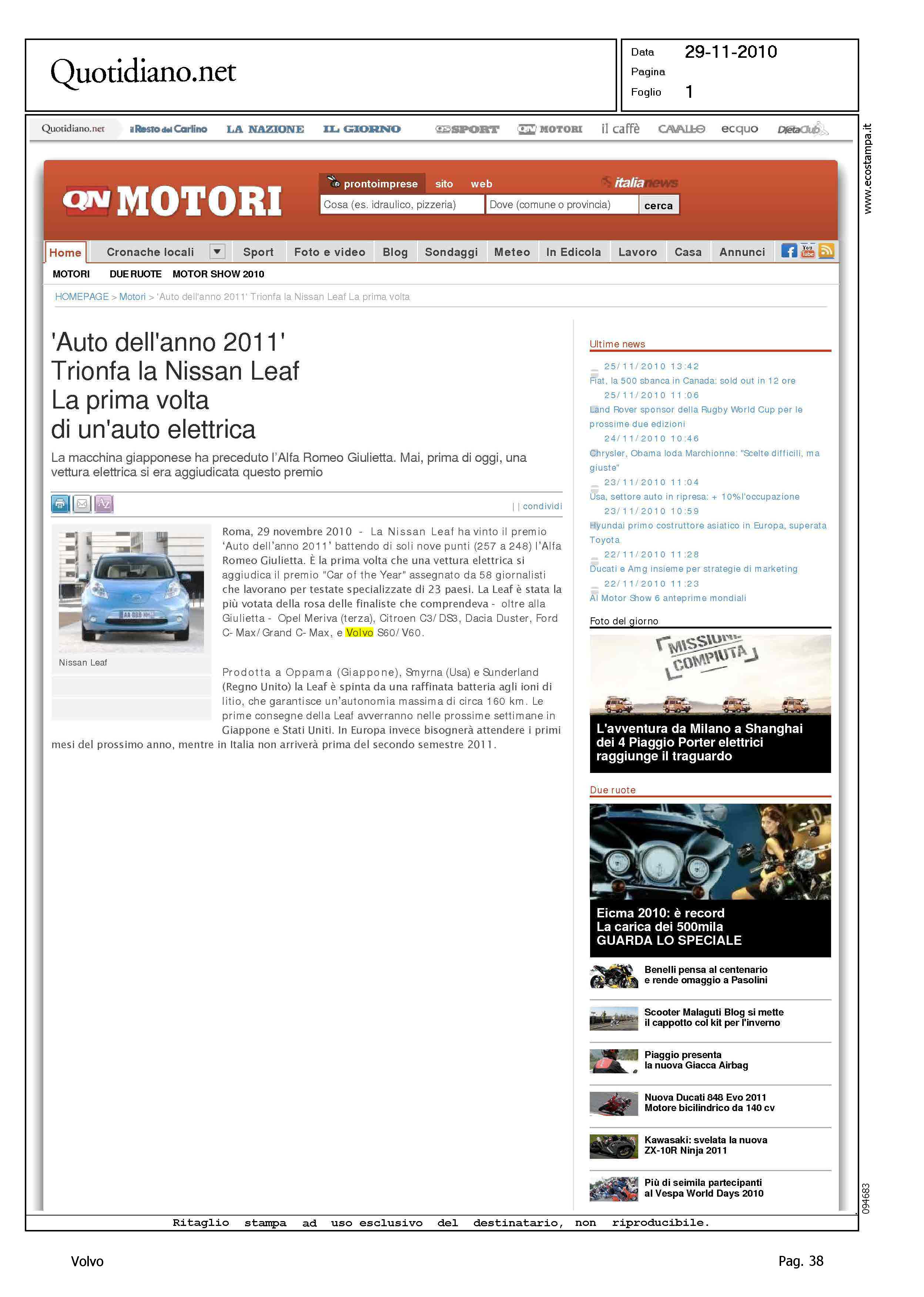 Title: 'AUTO DELL'ANNO 2011' - TRIONFA LA NISSAN LEAF - LA PRIMA VOLTA DI UN'AUTO ELETTRICA