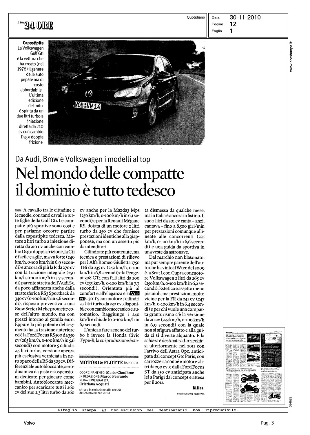 Author: DESIDERIO, NICOLALine: Corporate Model: Volvo C30 Subject: - Title: NEL MONDO DELLE COMPATTE IL DOMINIO E' TUTTO TEDESCOHighlight: VOLVO C30 T5 - MOTORE - PRESTAZIONI