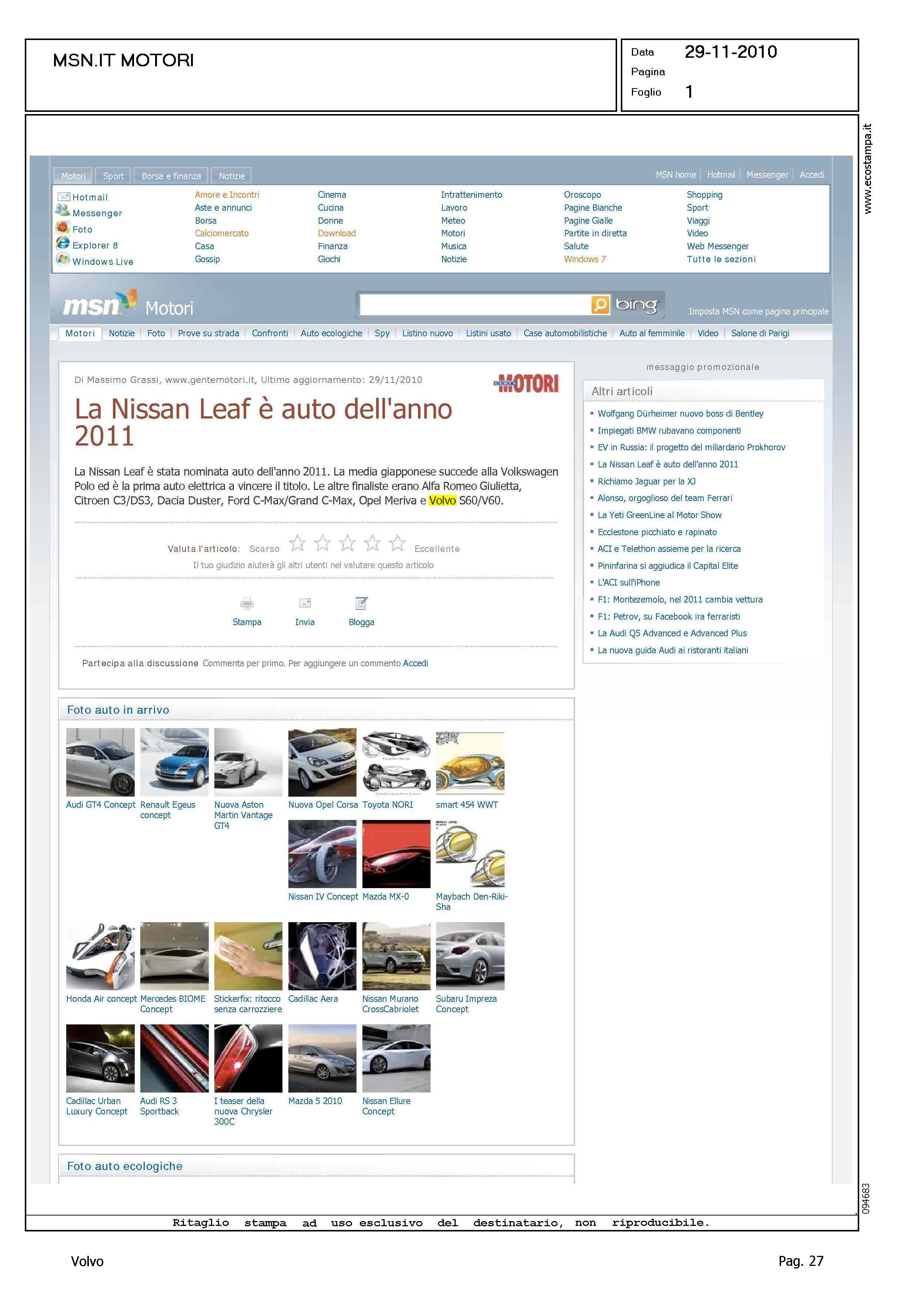 Author: Line: Corporate Model: Corporate Subject: - Title: LA NISSAN LEAF E' AUTO DELL'ANNO 2011Highlight: ELETTA L'AUTO DELL'ANNO 2011 - VOLVO S60/V60, 6/145 PUNTI